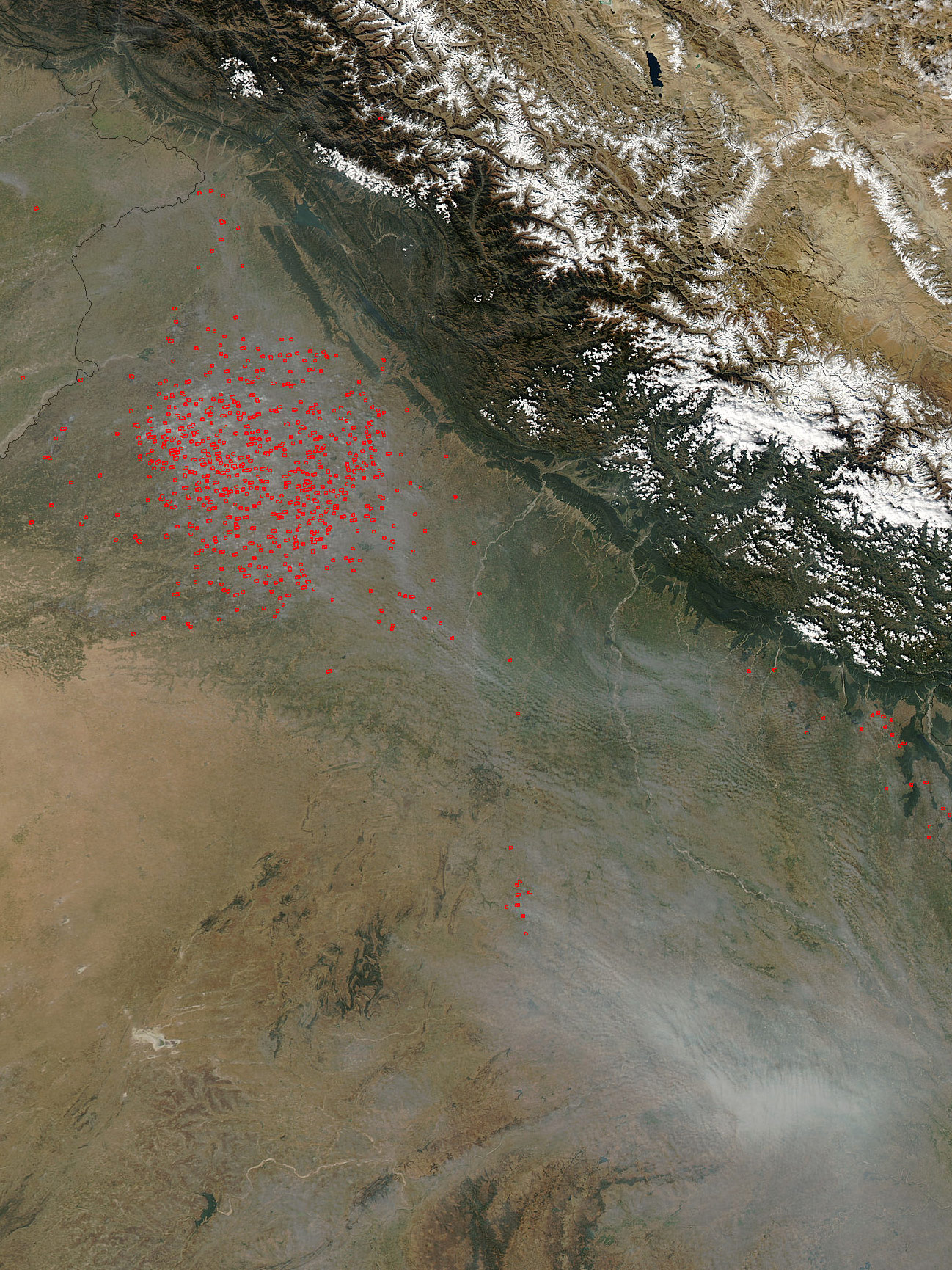 On the plains at the foothills of the Himalaya Mountains in northwestern India, scores of agricultural fires were burning on October 30, 2005. Shown in this image from the Moderate Resolution Imaging Spectroradiometer (MODIS) on NASA’s Aqua satellite, the fires (marked in red) are spreading smoke to the southeast along the base of the mountains. The fires are concentrated in the states of Punjab (closest to Pakistan, at left) and Haryana (to the southeast), two of India’s agricultural powerhouses.
