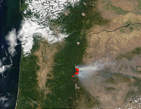 The fire complex known as the B&B Fire to firefighters is composed of the Booth (south) and Bear Butte (north) Fires in Oregon. As of Wednesday night (August 27, 2003), the fire was affecting more than 40,815 acres and was 30 percent contained. This image shows the actively burning areas of the fires detected by the Moderate Resolution Imaging Spectroradiometer (MODIS) on the Aqua satellite marked with red. The image was acquired on August 27, 2003. The gray patch at upper left is the city of Portland.