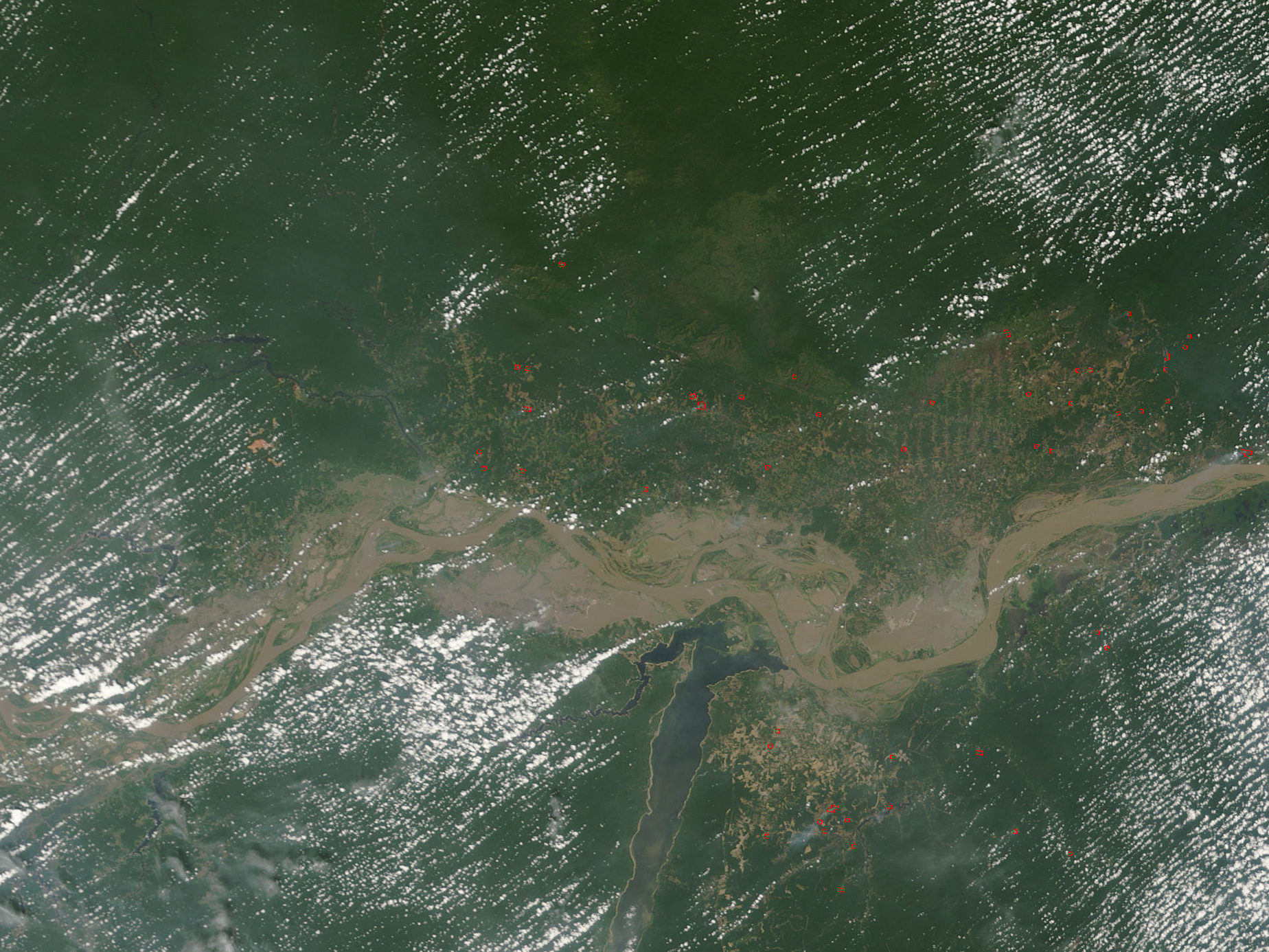 As they are doing in many locations in the Amazon, people are clearing away the rainforest in the region where the Tapajós River flows into the muddy Amazon in western Pará, Brazil. Fires are a common way for people to clear land and keep it cleared for pasture or farming, and on December 7, 2004, the Moderate Resolution Imaging Spectroradiometer (MODIS) on NASAâs Terra satellite captured this image of several fires (marked in red) burning in the area. Deforested areas are light green, while undisturbed forest is deep green. The Amazon reaches across the center of the image from west to east, and the Tapajós flows in from the south, near bottom center. The whole scene has a hazy appearance, caused by smoke from the fires pictured here, as well as other fires burning in places outside the boundaries of the image. Fires have been burning off and on in this region for more than a month.