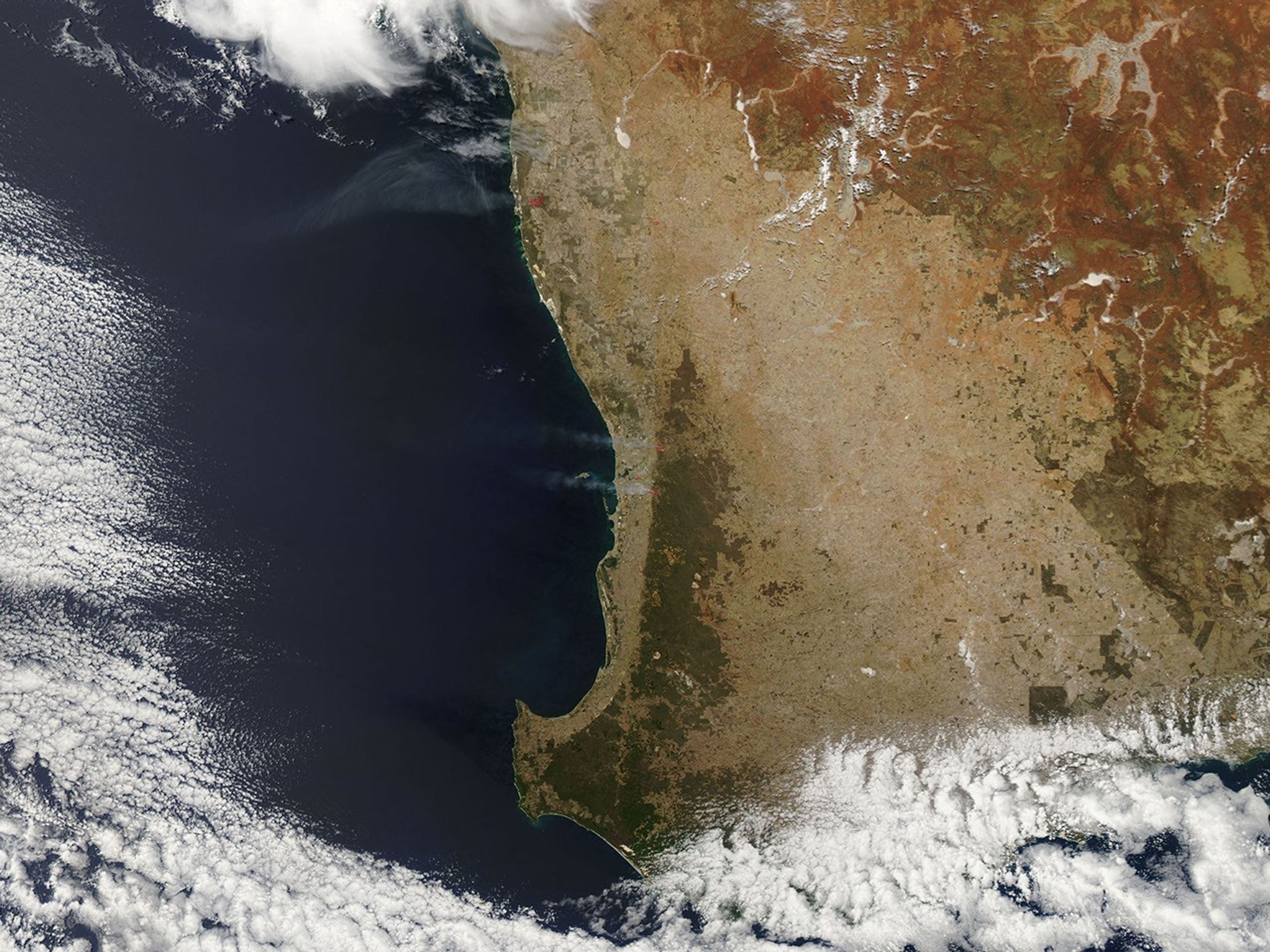 The Moderate Resolution Imaging Spectroradiometer (MODIS) on NASA’s Aqua satellite took the image at 2:20 p.m. local time. The instrument detected three fires, marked in red, including the damaging Roleystone Fire southeast of Perth. The second fire, the Red Hill (Gidgegannup) Fire, was burning in a less populated area near the John Forrest National Park. Both fires are in the darker, tree-covered hills east of the city, and both forced evacuations. The third fire is smaller and closer to the city.