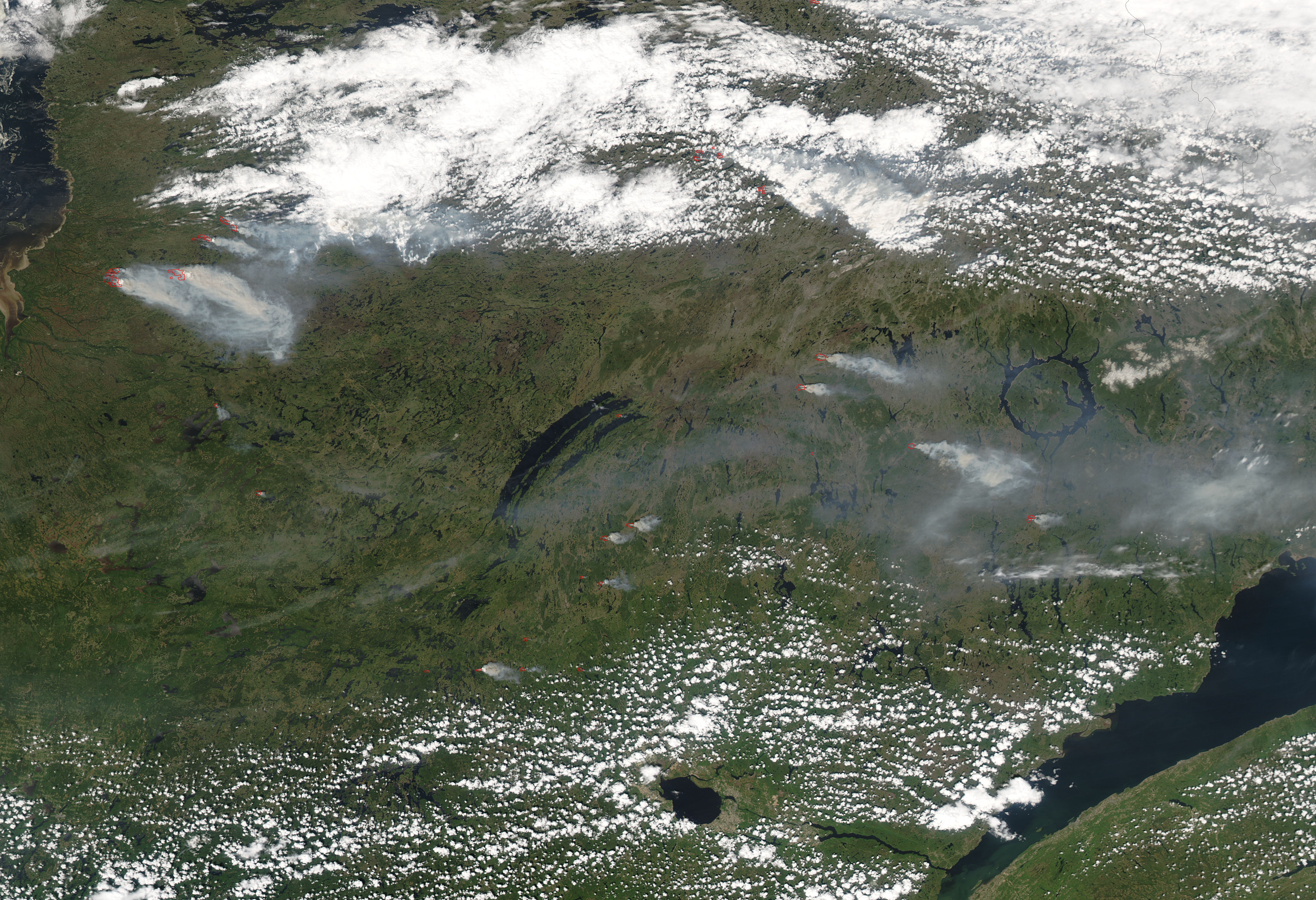 This image from the Moderate Resolution Imaging Spectroradiometer (MODIS) on NASA's Aqua satellite shows several large blazes to the east of James Bay (upper left) on June 1, 2005. Areas where MODIS detected active fires have been outlined in red.