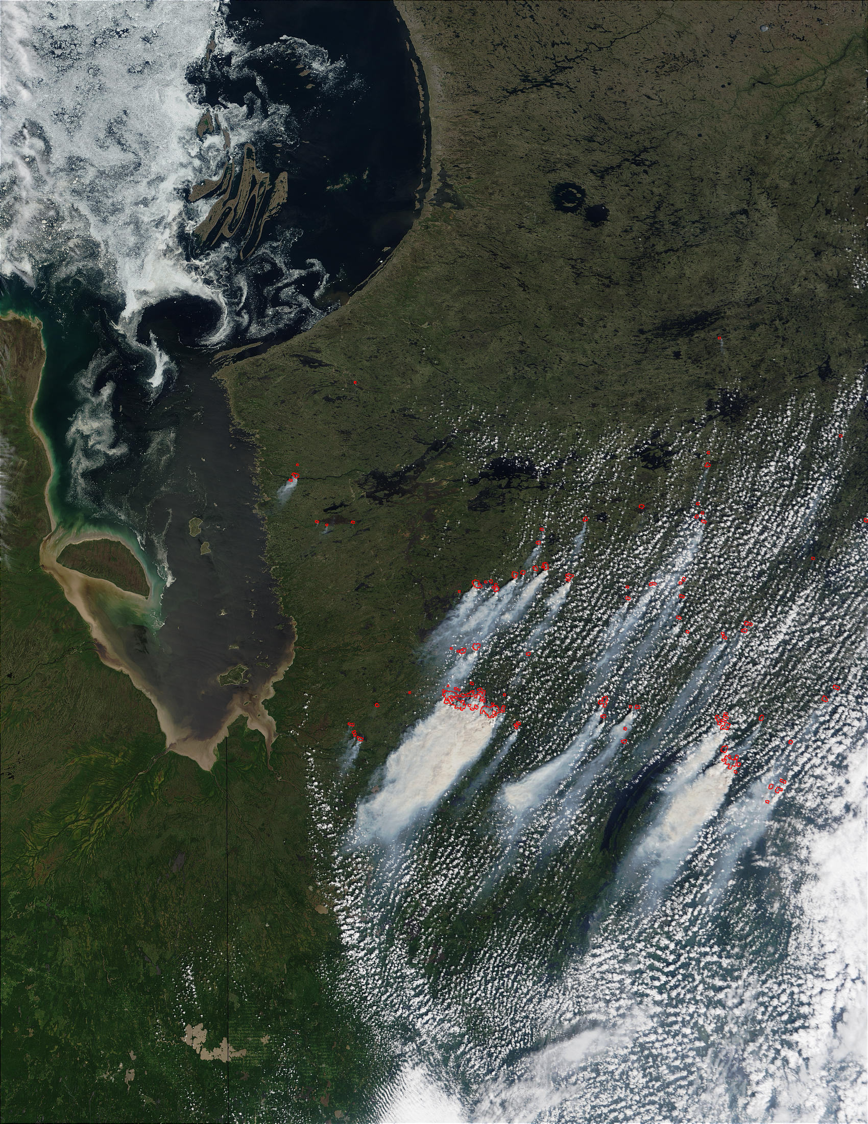 In central Quebec, Canada, numerous wildfires (red dots) are billowing thick smoke toward the southwest. Within days, the smoke had reached the Great Lakes and New England regions of the United States. This Moderate Resolution Imaging Spectroradiometer (MODIS) image was acquired on July 5, 2002.