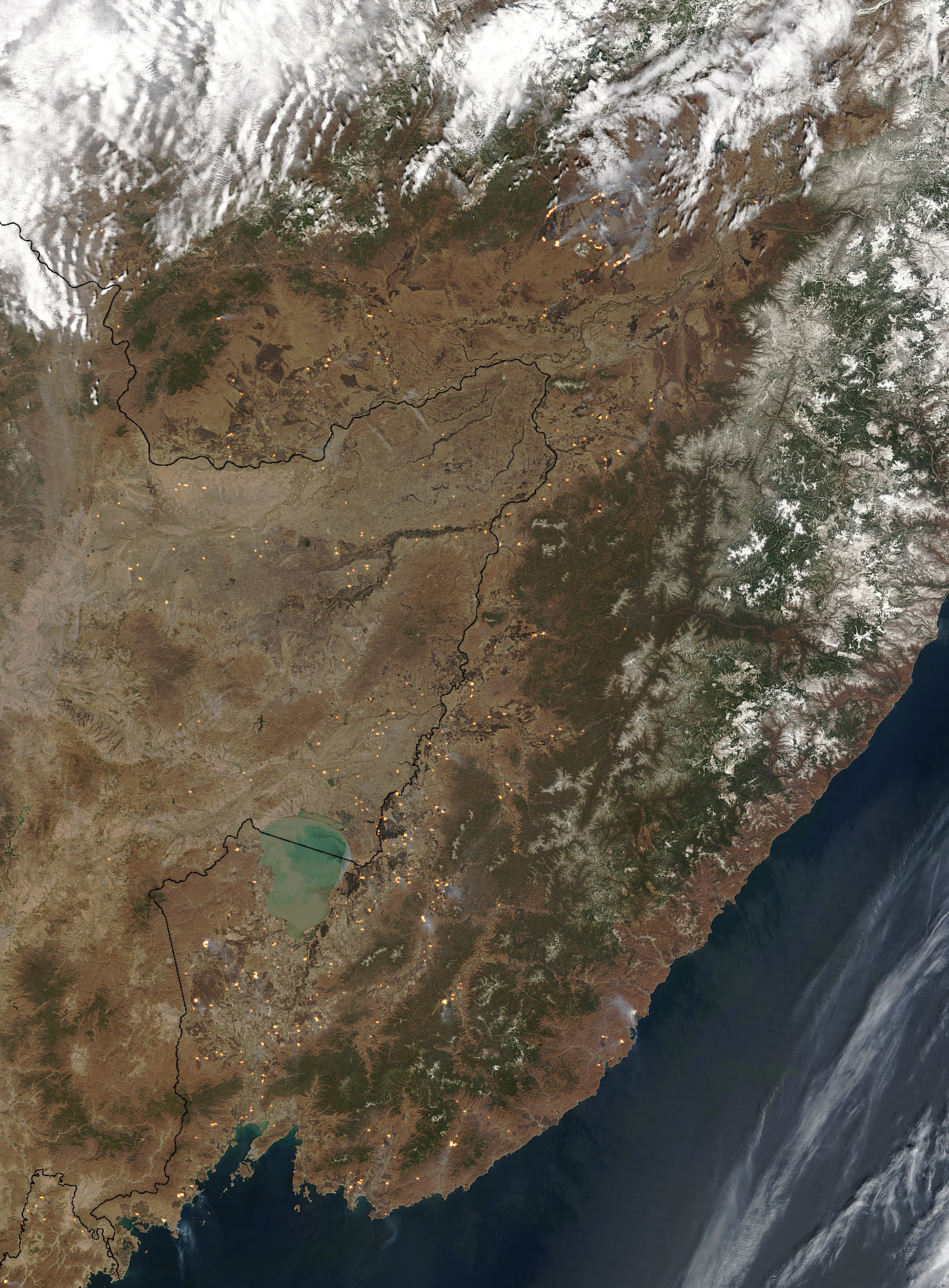 Spring is progressing and fires are increasing across eastern China and southeastern Russia in late April 2004. This image from the 28th shows widespread fire activity—probably agricultural—across the two countries. Active fire detections made by the Moderate Resolution Imaging Spectroradiometer (MODIS) on the Terra satellite have been marked in the scene in yellow.