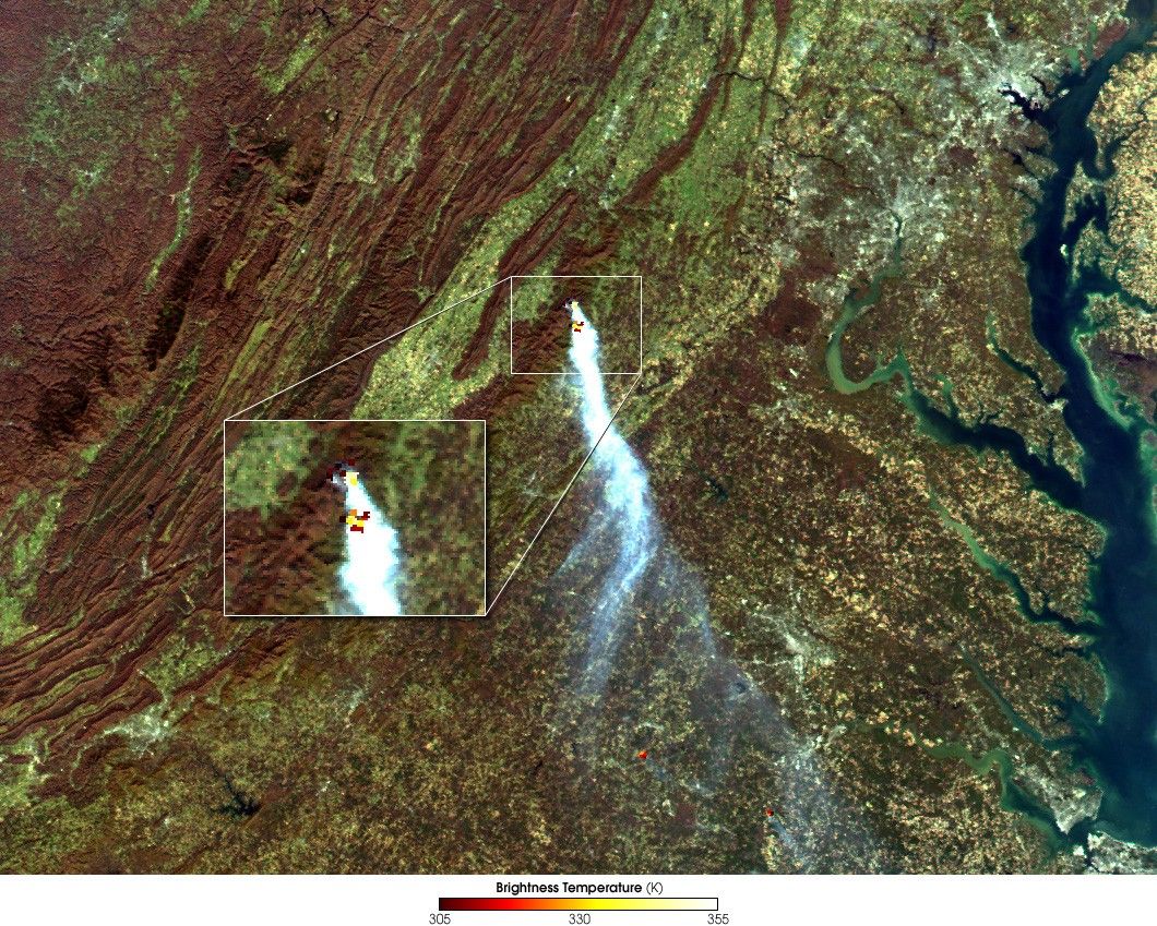 A large smoke plume has been streaming eastward from Virginia’sShenandoah National Park near Old Rag Mountain. Based on satelliteimages, it appears the blaze started sometime between October 30 and 31.This true-color image of the fire was obtained on November 1, 2000 by theModerate-resolution Imaging Spectroradiometer (MODIS), flying aboardNASA’s Terra spacecraft.Thermal Infrared data, overlaid on the color image,reveals the presence of two active fires underneath the smoke plume. The northernfire (upper) is burning near the Pinnacles Picnic Area along Skyline Drive. The southernfire (lower) is on Old Rag Mountain. Old Rag is one of the most popular hikesin the Washington, DC area, and features extremely rugged terrain, withgranite cliffs up to 90 feet high.