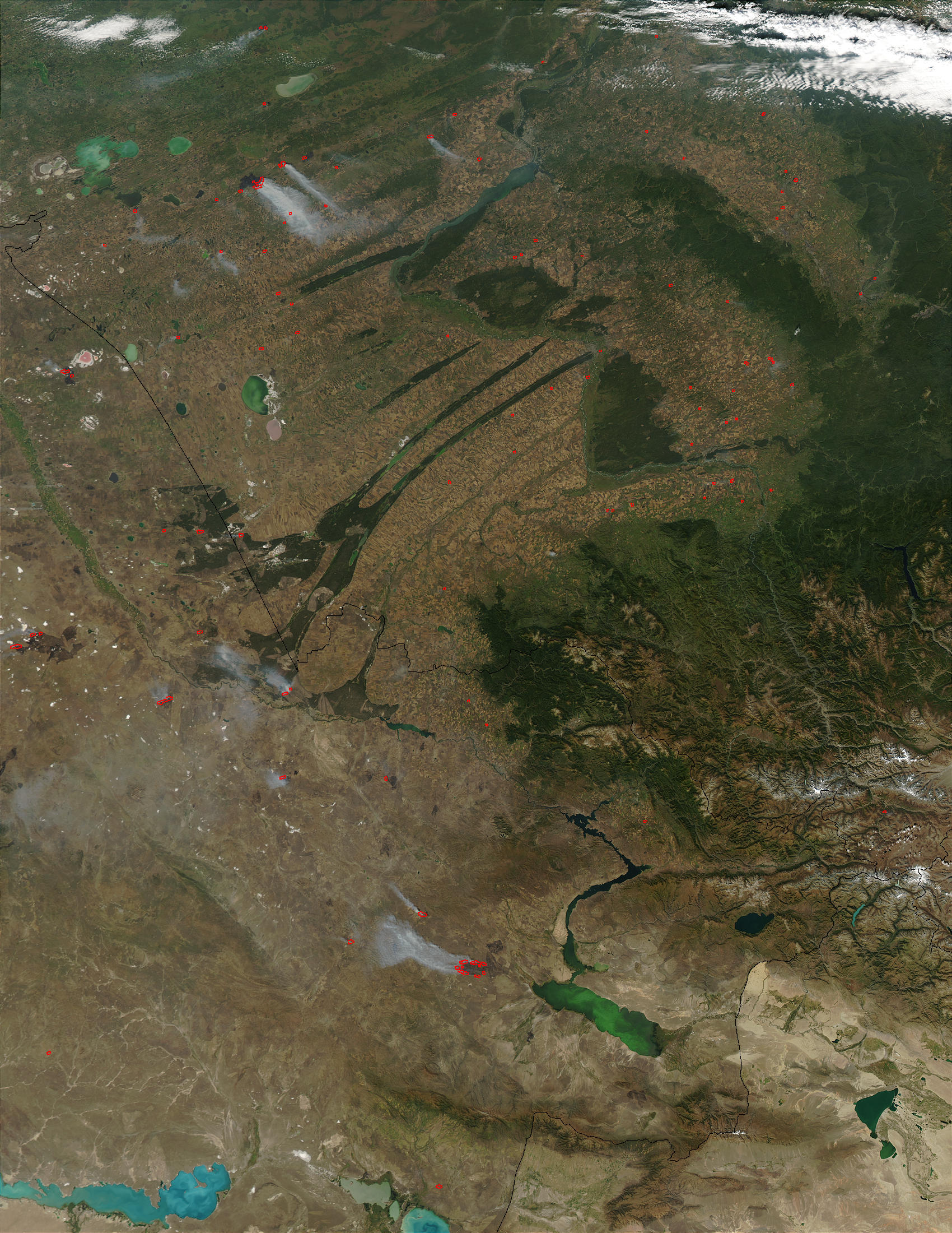 Across the plains of south-central Russia (top) and northern Kazakhstan (bottom) the Moderate Resolution Imaging Spectroradiometer (MODIS) on the Aqua satellite detected numerous fires, which are marked with red dots in this image from September 8, 2003. The large river making a sideways “W” shape in the center of the top half of the image is the Ob’ River, with its deep green wetlands tucked into the river bends. At the left center of the image is the Irtysh River, flowing through Kazakhstan.