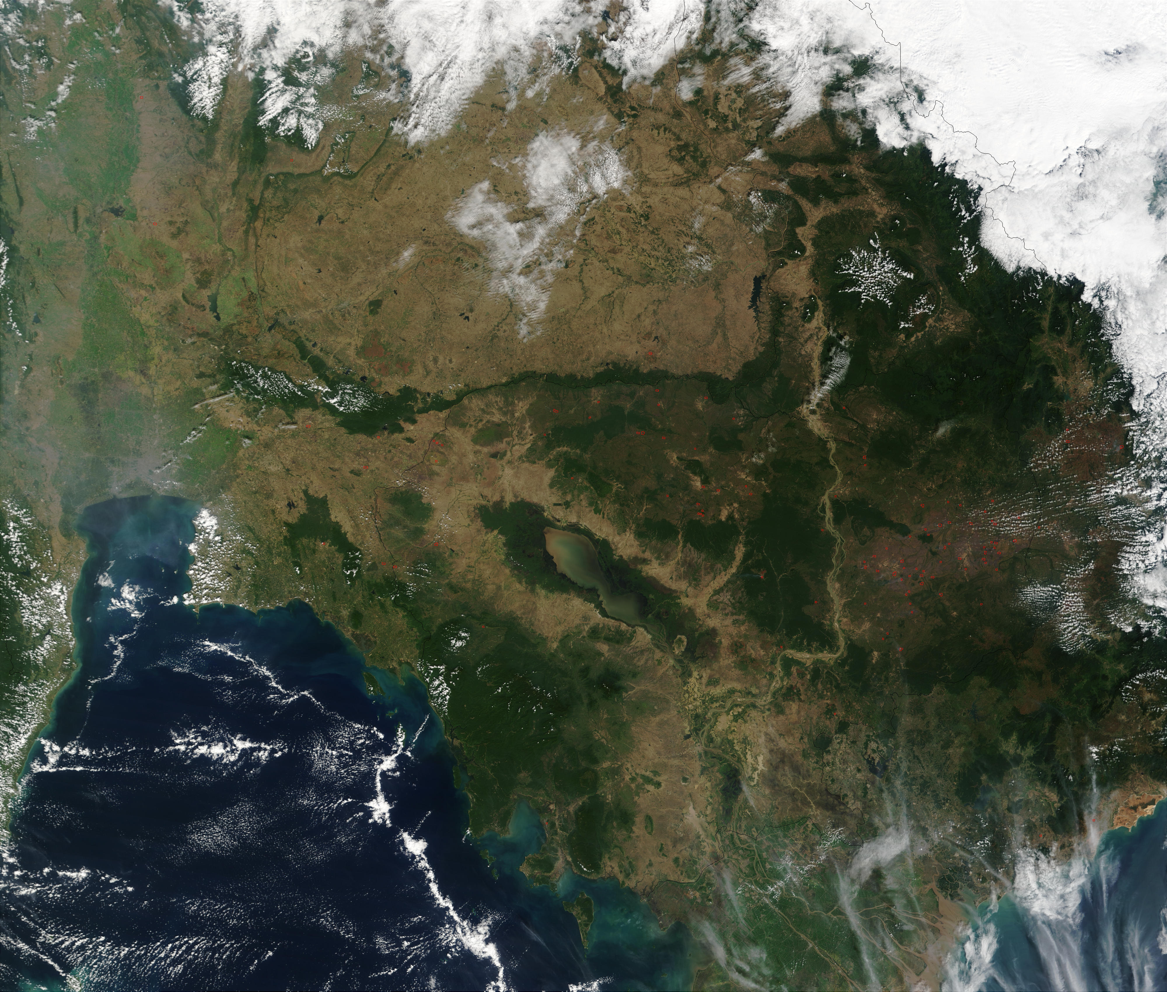 This true-color Moderate Resolution Imaging Spectroradiometer (MODIS) image from January 6, 2002, shows scattered fires (red dots) burning across Southeast Asia. At upper left is Thailand, in the center is Cambodia, and along the right edge is Vietnam. In Thailand, the city of Bangkok appears as a large grayish patch along the coast of the northernmost part of the Gulf of Thailand. In Cambodia, the Tonlâ Sap Lake appears deep green and brown. The river running southward through Cambodia and emptying into the South China Sea is the Mekong River.