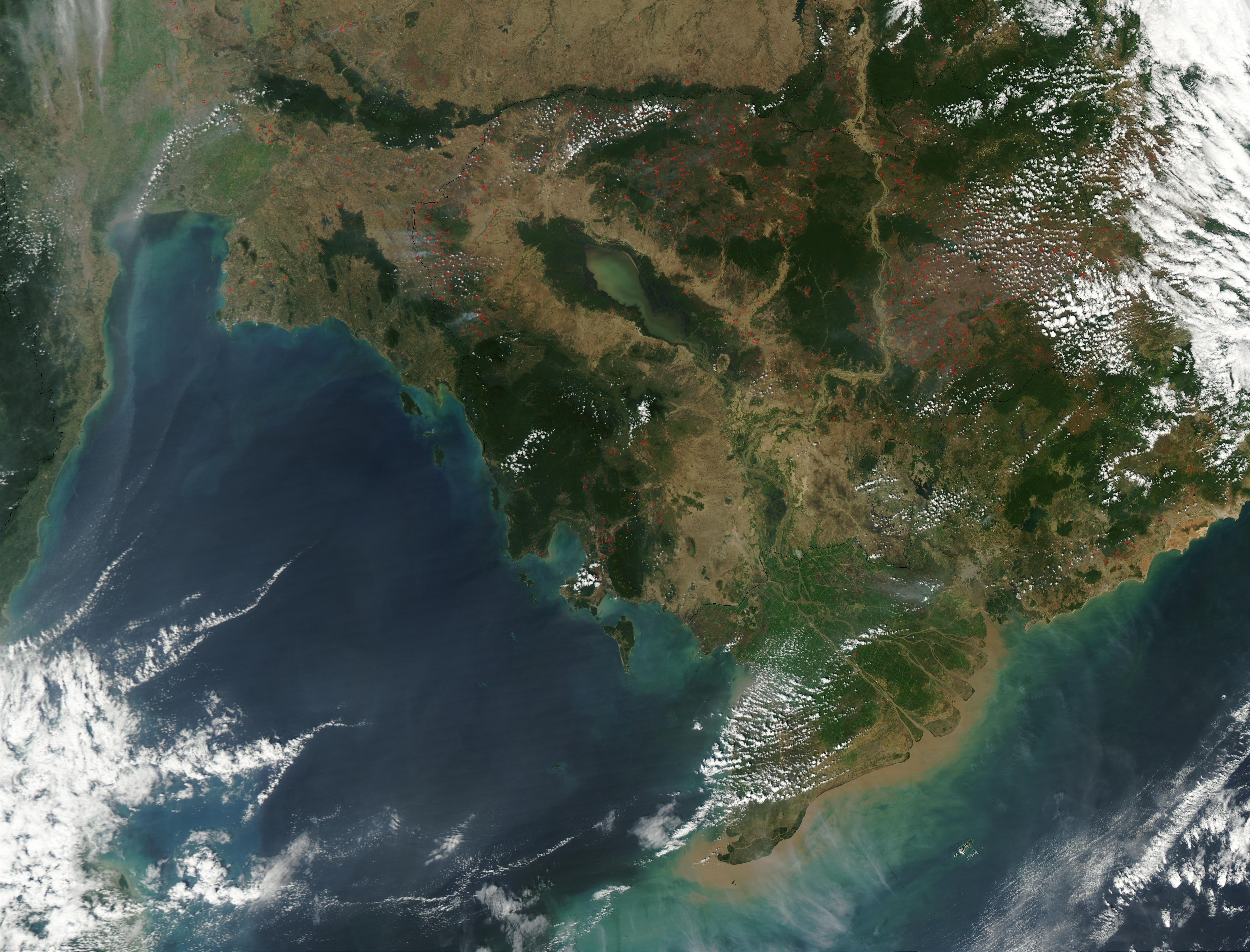 Fires in Southeast Asia are becoming more widespread. This true-color Moderate Resolution Imaging Spectroradiometer (MODIS) image from the Aqua satellite on January 17, 2003, shows fires marked in red. Cambodia is in the image center, Thailand is at left, while Vietnam is at right. The Mekong Rivers cuts down through Cambodia in a brown line.