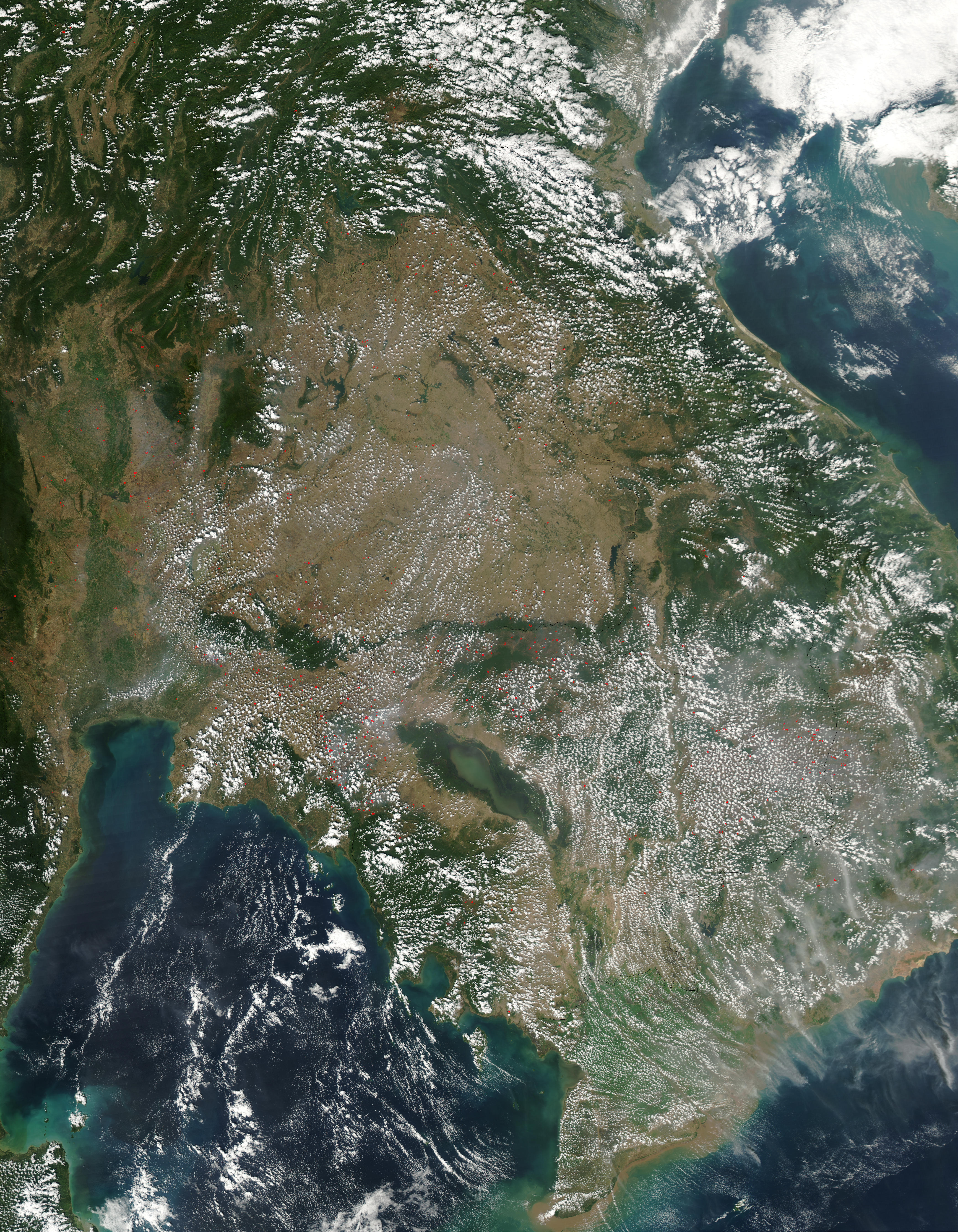 In Southeast Asia, fires (red dots) continue to spread across a wider area of Thailand (left), Cambodia (center), and Vietnam (right). This true-color Moderate Resolution Imaging Spectroradiometer (MODIS) image from the Aqua satellite was acquired January 22, 2003.