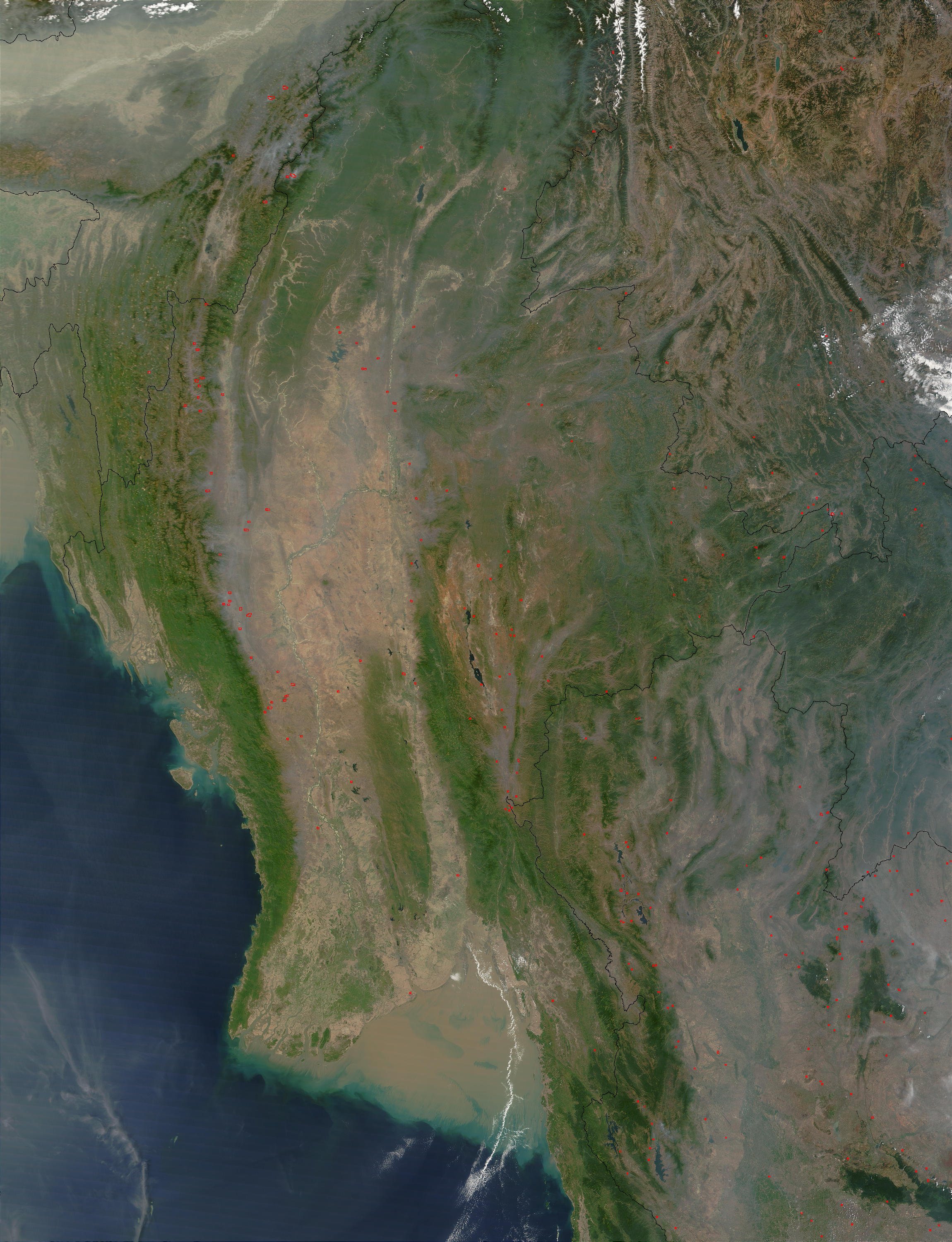 On March 7, 2003, the Terra satellite’s morning overpass of Southeast Asia revealed smoke snaking along ridges and tucked into low-lying areas. Scattered fires were detected by the Moderate Resolution Imaging Spectroradiometer (MODIS) and are marked with red dots. Countries shown are (west to east) Bangladesh, India, and Myanmar; and (top right to bottom) China, Laos, and Thailand. Compare this image to an afternoon image of the same region and notice the increased fire activity.