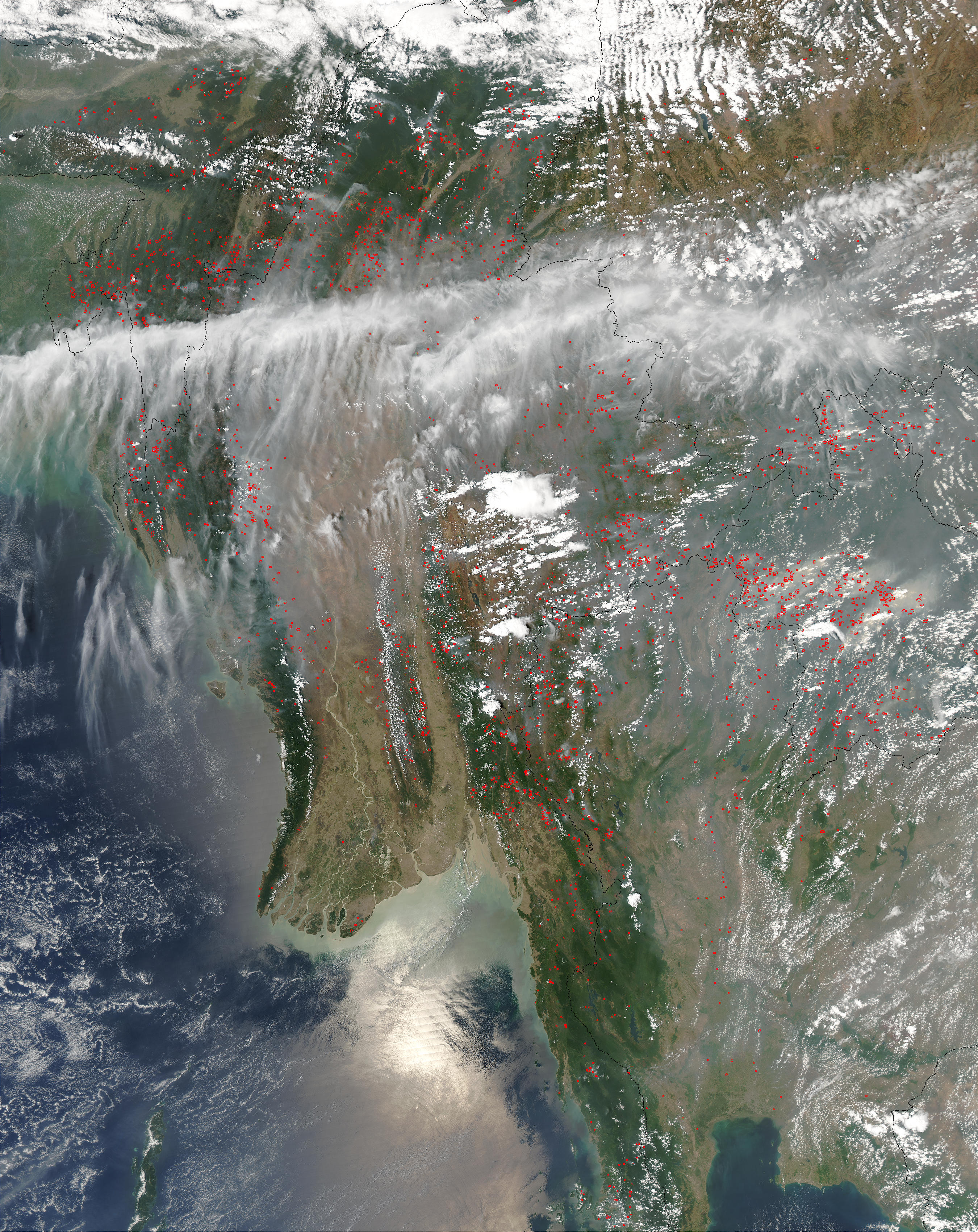 This image of fires (red dots) in Myanmar (left) and Thailand (right) shows just a fraction of the area in Southeast Asia experiencing widespread and intense biomass burning on April 10, 2003. See the high resolution image for the entire area, which also shows parts of India, China, Laos, Vietnam, and Cambodia.