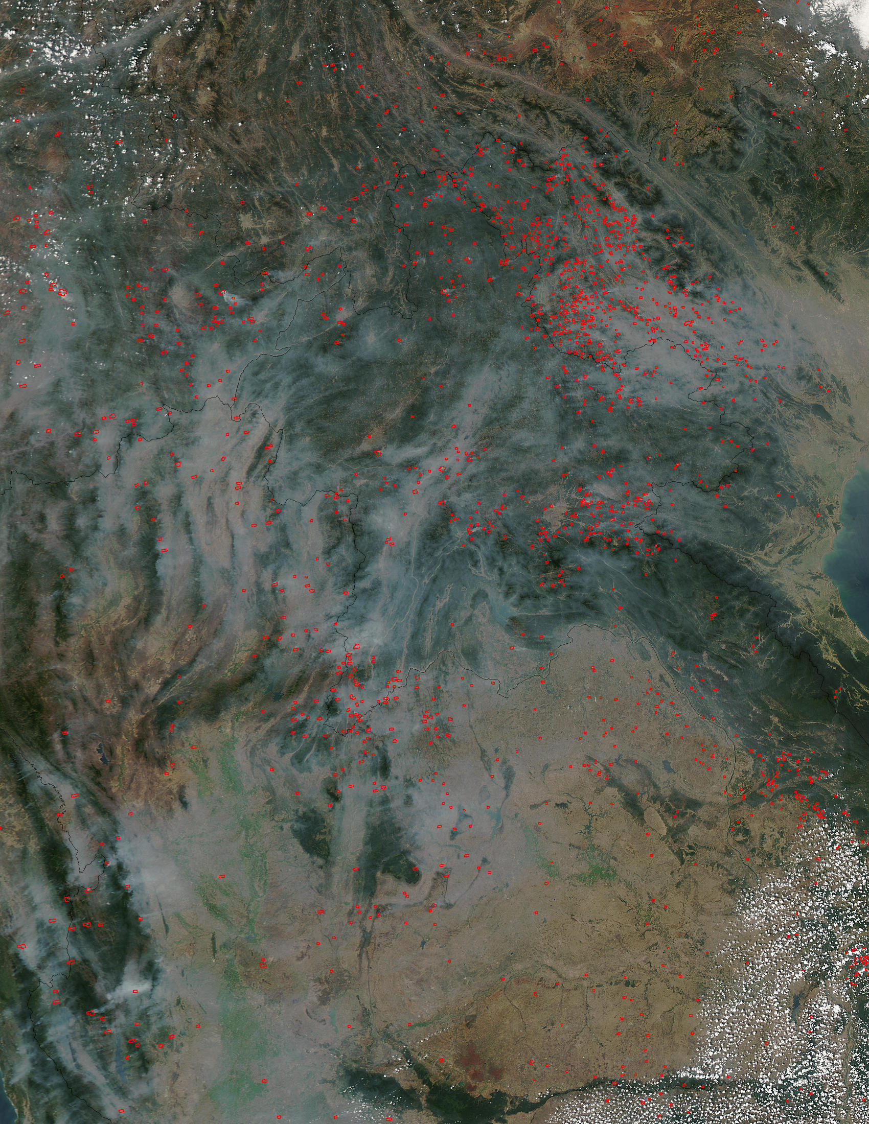Gray-blue smoke spreads across Southeast Asia in this Moderate Resolution Imaging Spectroradiometer (MODIS) image captured by the Aqua satellite on March 1, 2004. Scores of fires were detected by the sensor and have been marked in red in the image. Countries shown in the image are China (top), Vietnam (right edge), Laos (left of Vietnam), Thailand (bottom center), and Myanmar (top and bottom left).