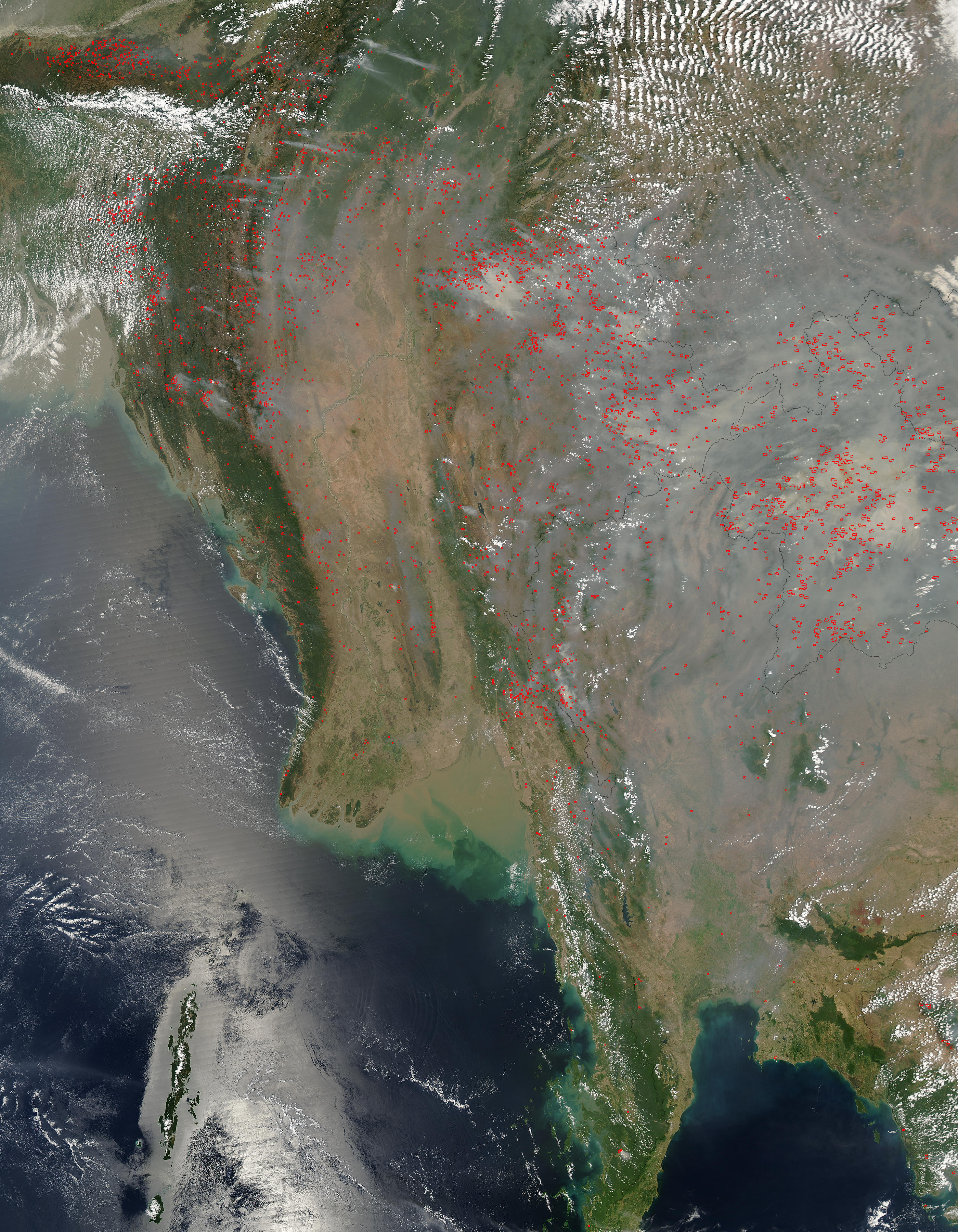 A blanket of smoke from scores of fires burning in Southeast Asia hangs in the skies in this Moderate Resolution Imaging Spectroradiometer (MODIS) image from the Aqua satellite captured on March 25, 2004. Fires, marked in red, are burning in (clockwise from top left) India, Myanmar, China, Vietnam, Laos, and Thailand. The annual agricultural fire season has been ongoing since early February, and has seemed especially intense—more fires and thicker smoke—in MODIS images from mid-March on.