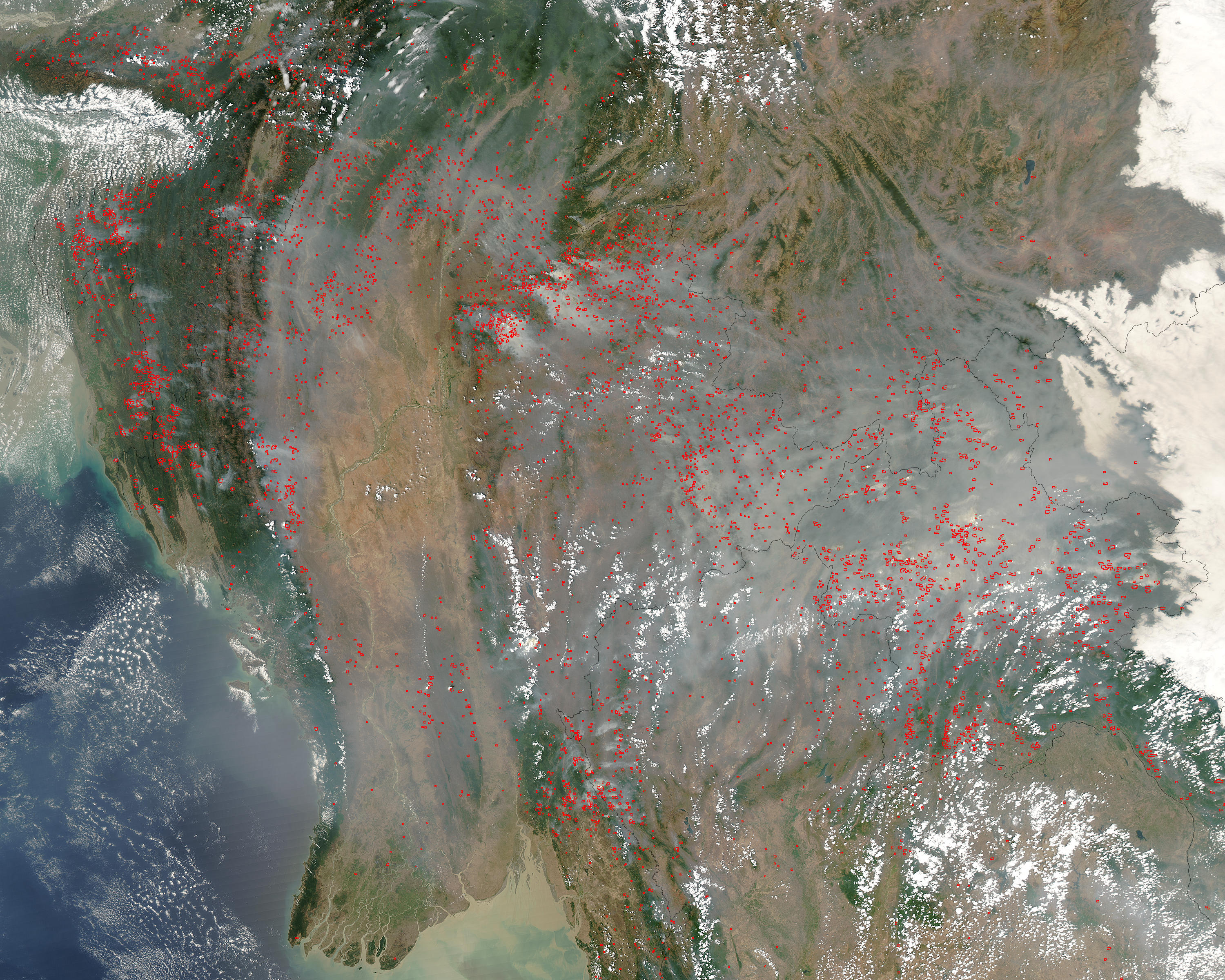 Thousands of fires burning in Southeast Asia were blanketing the region with blue-gray smoke at the time this Moderate Resolution Imaging Spectroradiometer (MODIS) image was captured by the Aqua satellite on March 27, 2004. MODIS has been capturing images of the region’s agricultural burning season since early February, but activity seems to have picked up considerably in mid to late March. Though agricultural fires are not necessarily immediately hazardous, such large-scale burning can have a strong impact on weather, climate, human health, and natural resources.