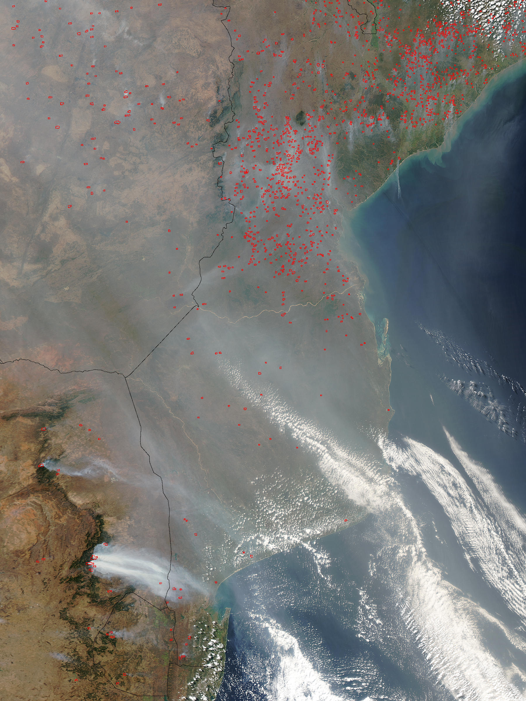 Smoke hangs over southern Africa on August 20, 2003, from the scores of active fires burning in the region and in places farther north. The active fire detections made by the Moderate Resolution Imaging Spectroradiometer (MODIS) on the Aqua satellite across Zimbabwe (top left), Mozambique (right), South Africa (lower left), and Lesotho (bottom center) have been marked in red in the image.