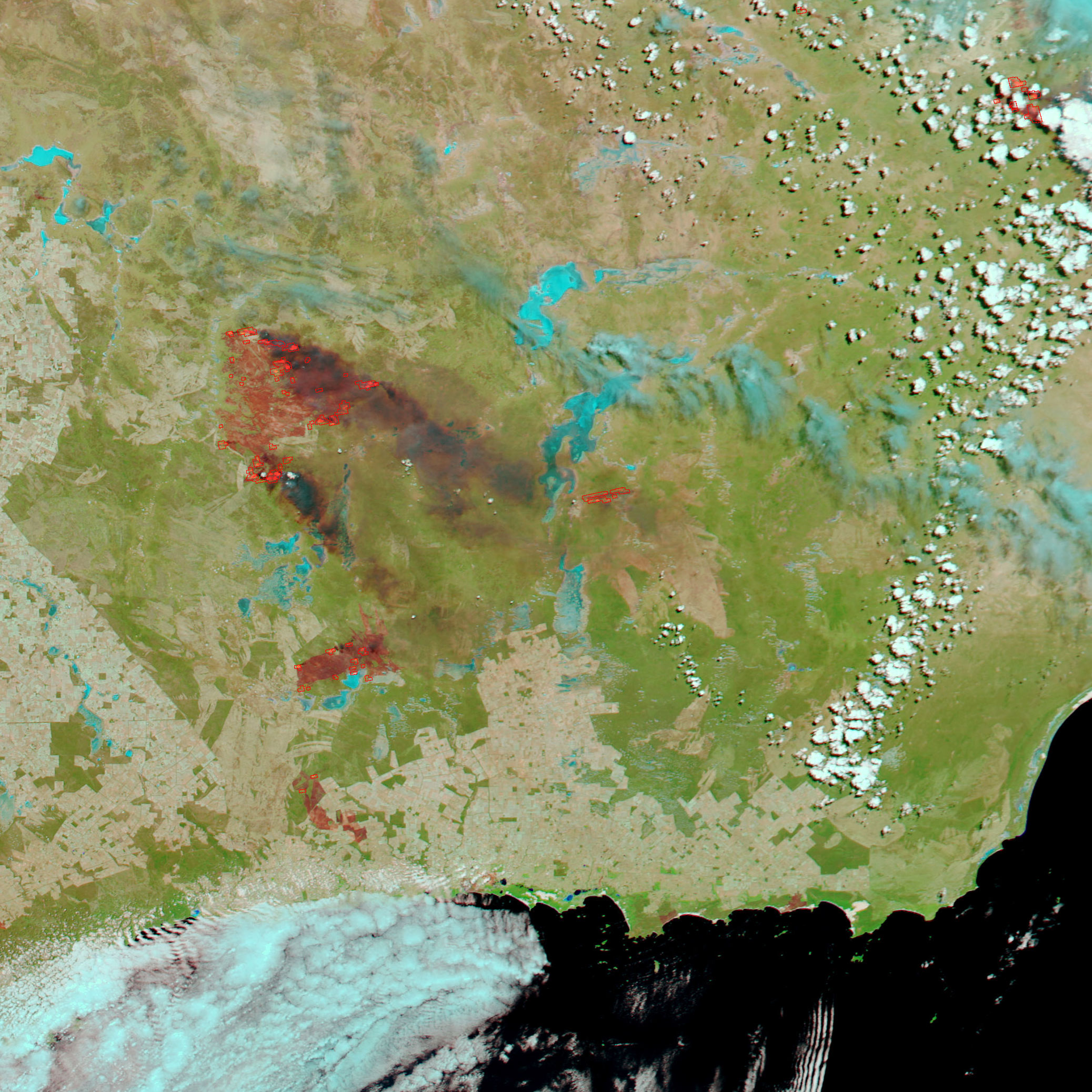 In the southwestern corner of Western Australia, several large fires were burning on December 21, 2001, when NASAâs Aqua satellite passed overhead. Over the weekend of December 18, firefighters contained several lightning-triggered fires burning along the southern coast, but these large fires to the north continued to rage. The image above is made from observations from the Moderate Resolution Imaging Spectroradiometer (MODIS) on Aqua. Vegetation appears bright green, burned areas appear reddish-brown, the ocean appears blue-black, and seasonal, salty lakes appear turquoise.