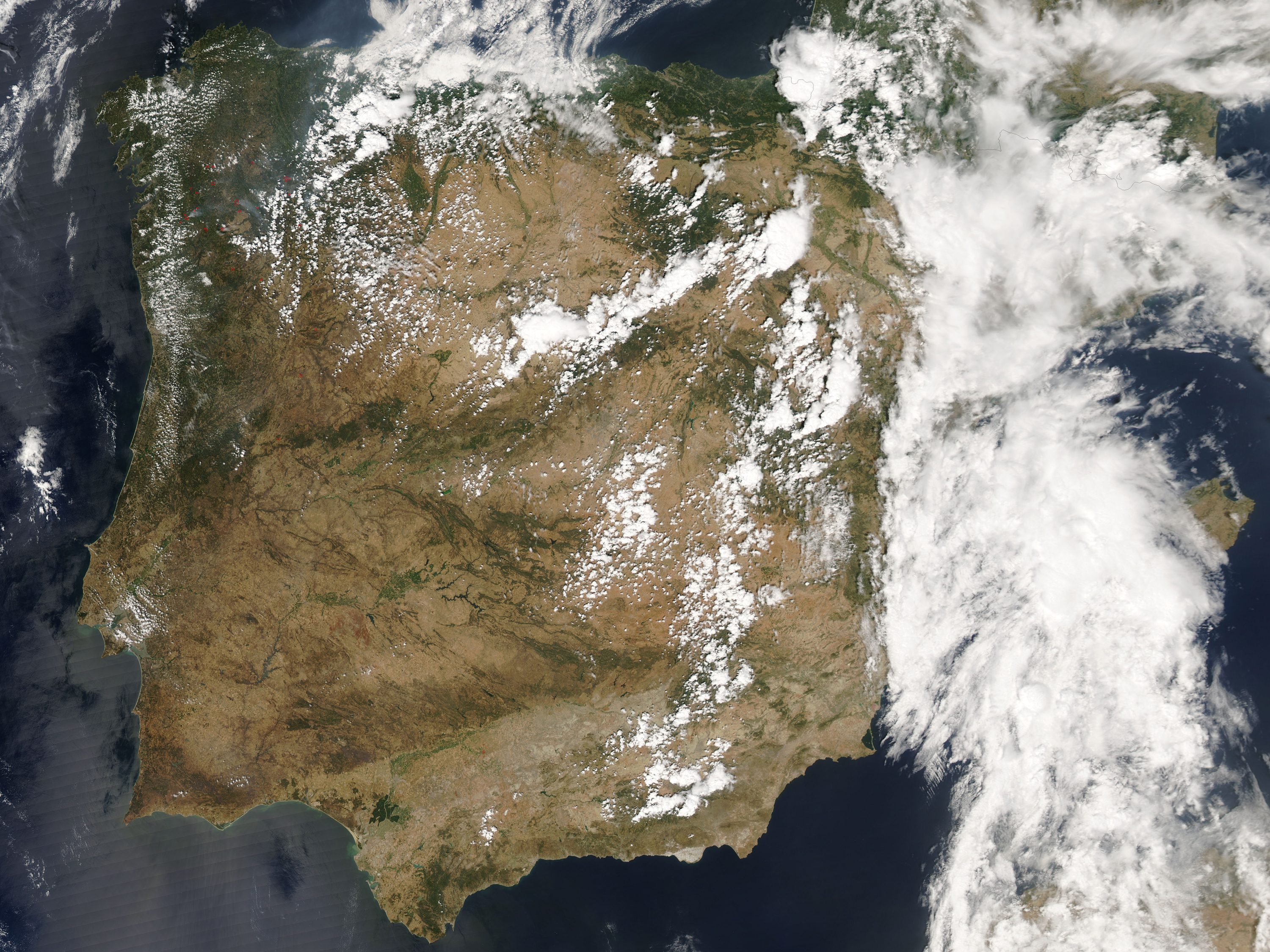 In late July 2004, fires broke outâmany due to arsonâacross Spain and Portugal. According to news reports, five new fires broke out on Saturday, July 31, in northwest Spain. This image was captured by the Moderate Resolution Imaging Spectroradiometer (MODIS) on NASAâs Aqua satellite on August 2, 2004, and areas where MODIS detected active fires are outlined in red. The largest concentration of fires is located in the Galicia region, one of Spainâs 19 administrative divisions, which are called âautonomous communities.â South of the large concentration of fires in Spain, MODIS detected a few scattered fires burning in Portugal. The high-resolution image provided above is 500 meters per pixel. The MODIS Rapid Response System provides this image at additional resolutions.