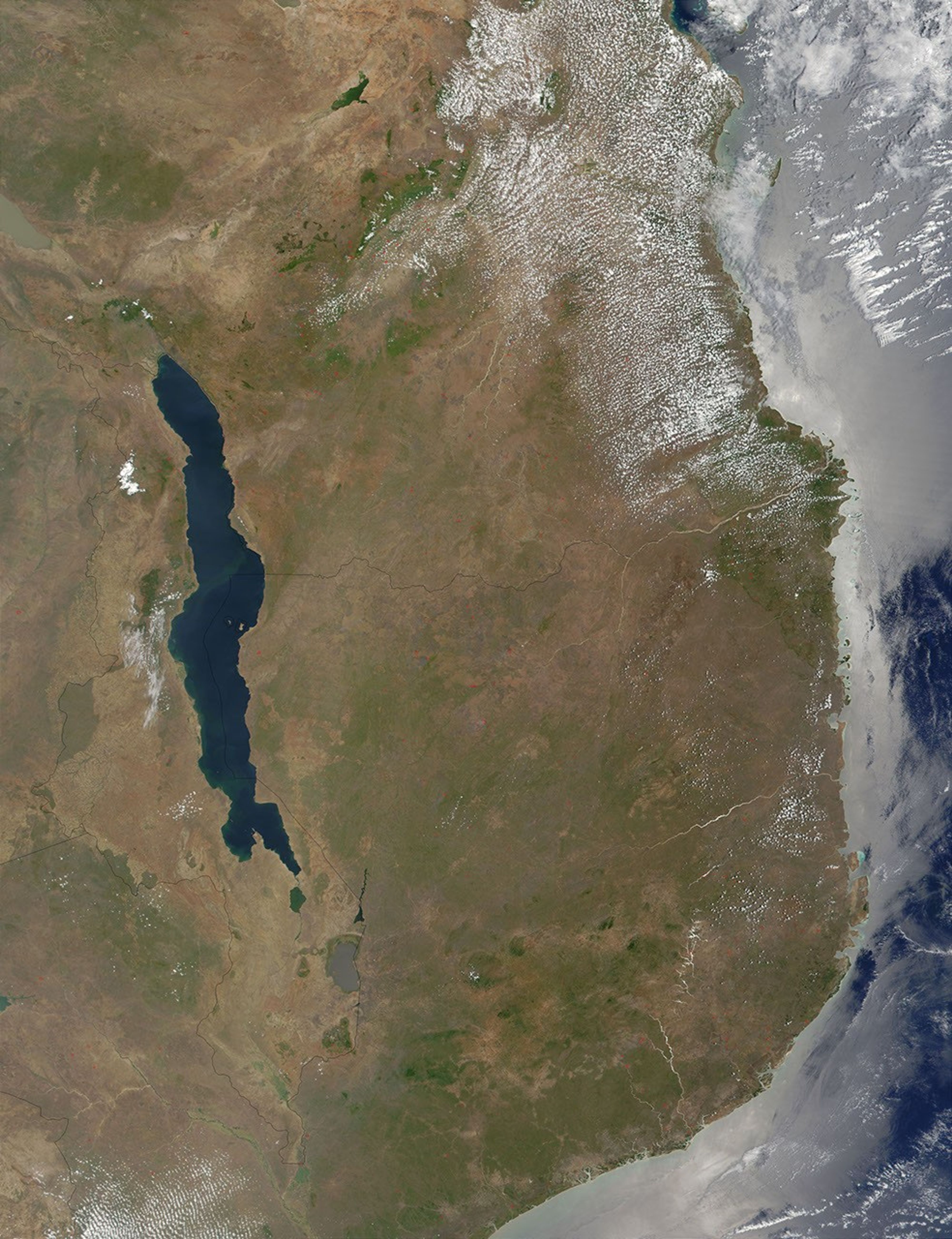 Like many countries, the southeastern African country of Malawi faces the challenge of balancing a growing population's need for food and energy with preservation of natural resources. This MODIS image from November 8, 2001, shows Malawi surrounded by (starting from top and moving clockwise) Tanzania, Mozambique, and northern Zambia.