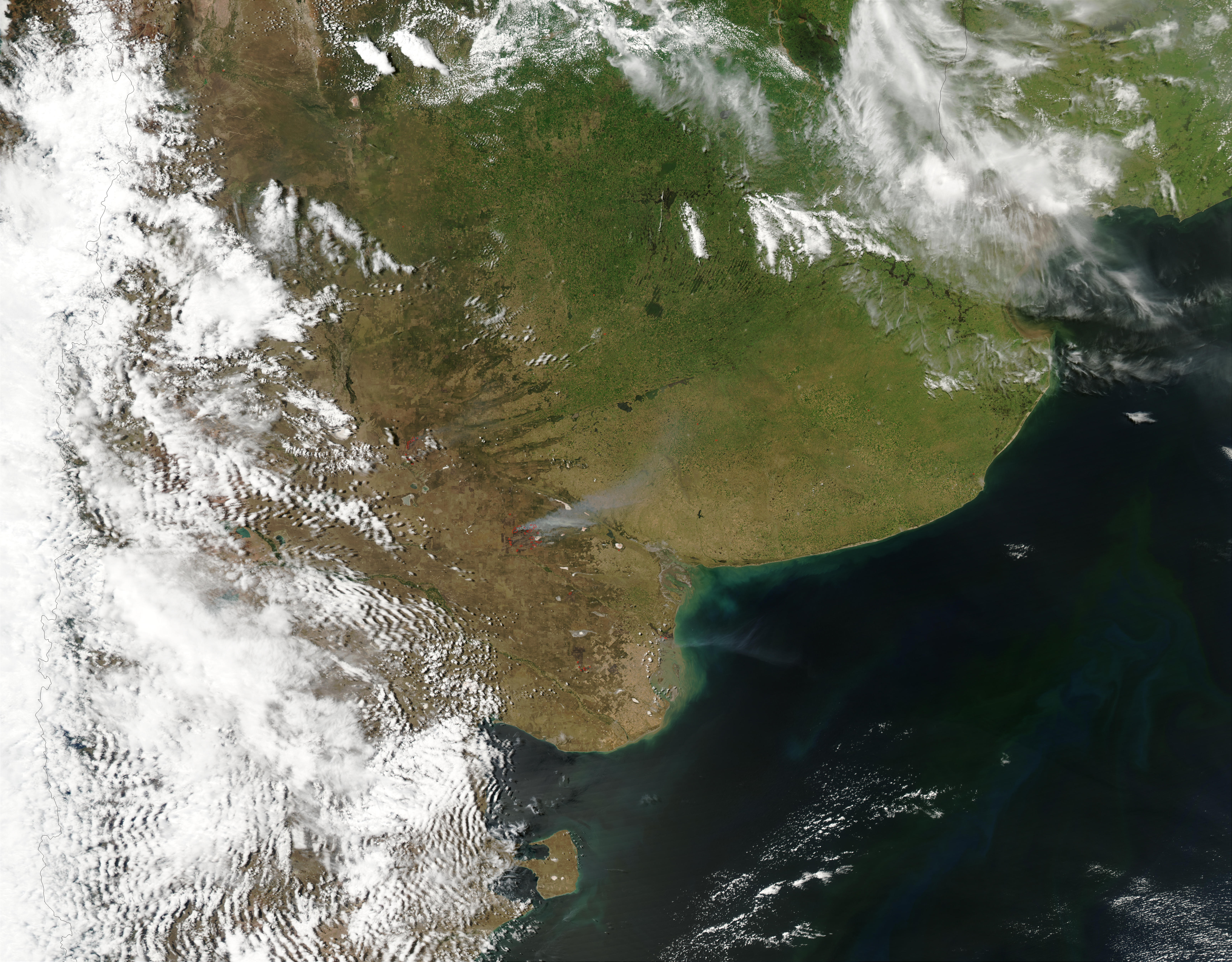 This true-color image from the Moderate Resolution Imaging Spectroradiometer (MODIS) show fires (red dots) in Argentina on January 20, 2003. Across the Pampas, which is a large, relatively flat grassland (image right), a few small fires were detected, while to the south, larger fires were burning and producing grayish smoke plumes. In southern Argentina, the rainy season comes in the winter (Northern Hemisphere summer), and fire season continues from late spring into early summer (Northern Hemisphere fall and winter).