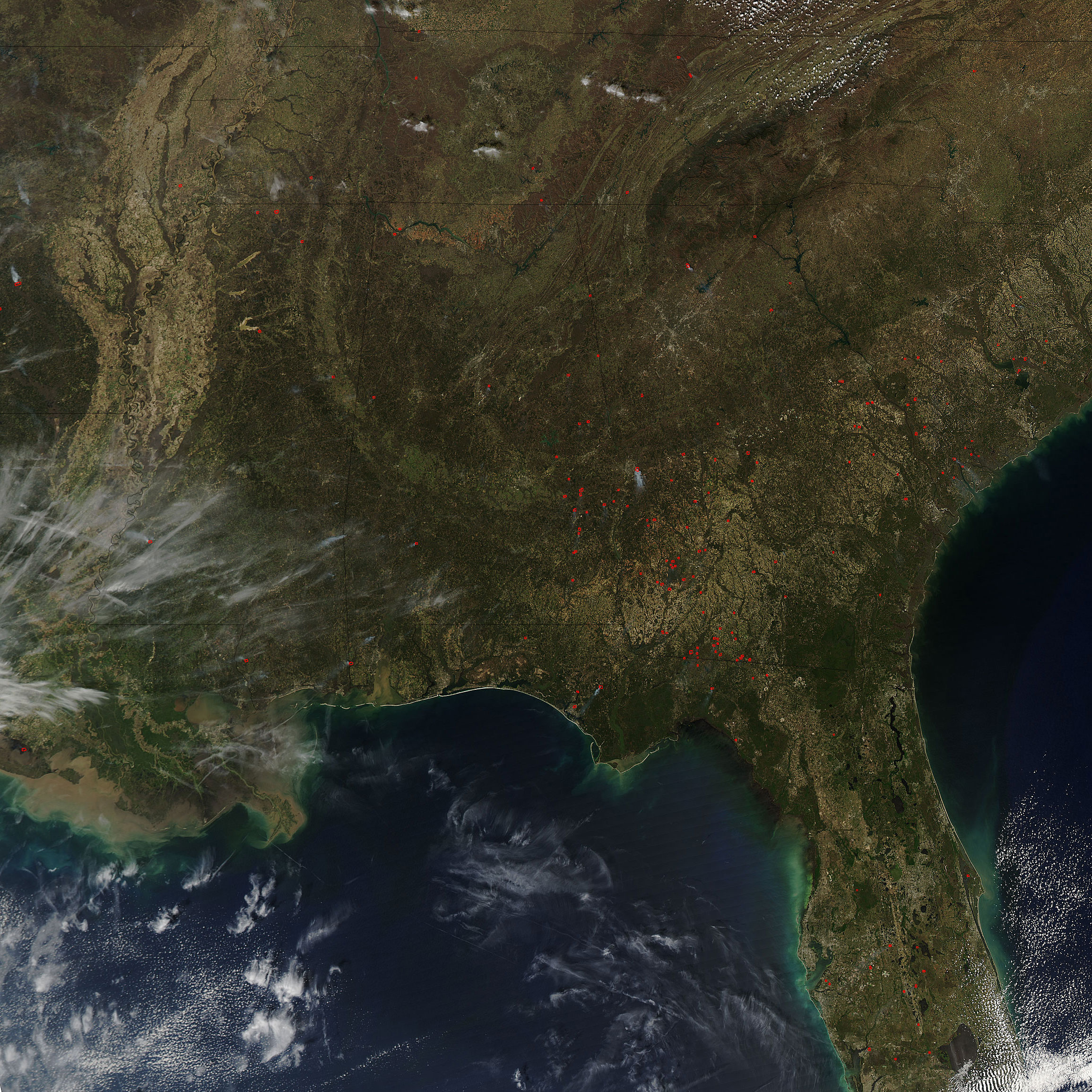 Dozens of fires were burning in the Southeast on March 15, 2006, when the Moderate Resolution Imaging Spectroradiometer (MODIS) on NASA’s Aqua satellite passed over the region. Places where the sensor detected actively burning fires are marked in red. According to reports from the National Interagency Fire Center from March 16, numerous types of fires were burning in the Southeast, including prescribed fires (planned fires that land managers use to manage natural resources), lightning-caused fires, and human-caused fires. The high-resolution image provided above has a spatial resolution of 500 meters per pixel. The MODIS Rapid Response System provides this image at additional resolutions.