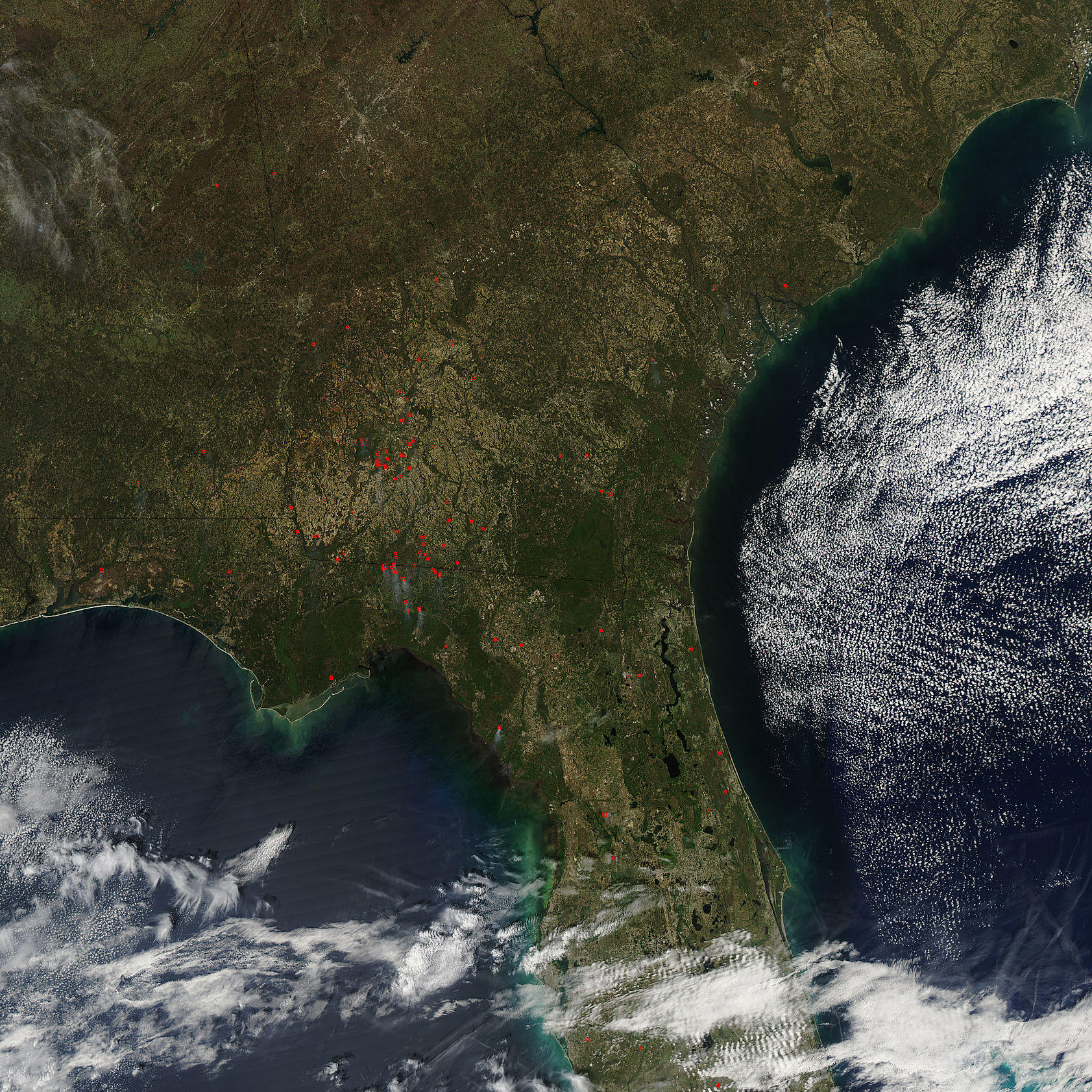 In the Southeast, scattered fires were burning across Alabama, Georgia, and Florida on March 22, 2006, when the Moderate Resolution Imaging Spectroradiometer (MODIS) on NASA’s Aqua satellite passed overhead. According to the March 22 report from the Southern Area Coordination Center, a few prescribed fires (intentional fires set by land managers for natural resource management) were underway across the Southern District, but the majority of the fires were of other human origins.