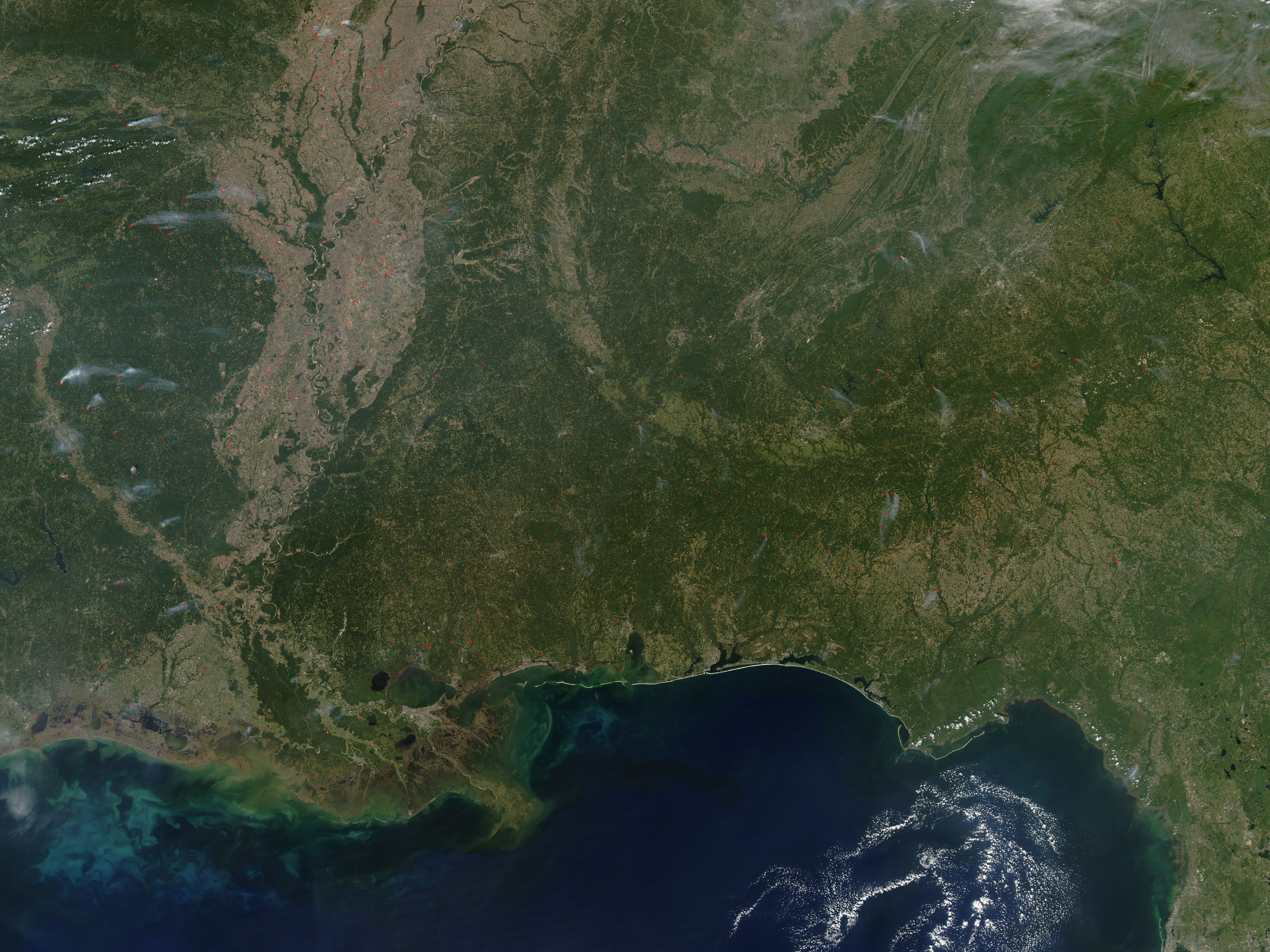 In the Mississippi River floodplain and in states across the South, many fires were burning on October 18, 2005, when the Moderate Resolution Imaging Spectroradiometer (MODIS) on NASA’s Aqua satellite passed over the region and collected this image. Fires that MODIS detected are marked with red dots, and many have small plumes of smoke. According to reports from the Southern Area Coordination Center for October 19, many types of fires were occurring across the region—some caused by lightning, some caused accidentally by people, and others started by land management officials as prescribed, or planned, burns to manage natural resources.