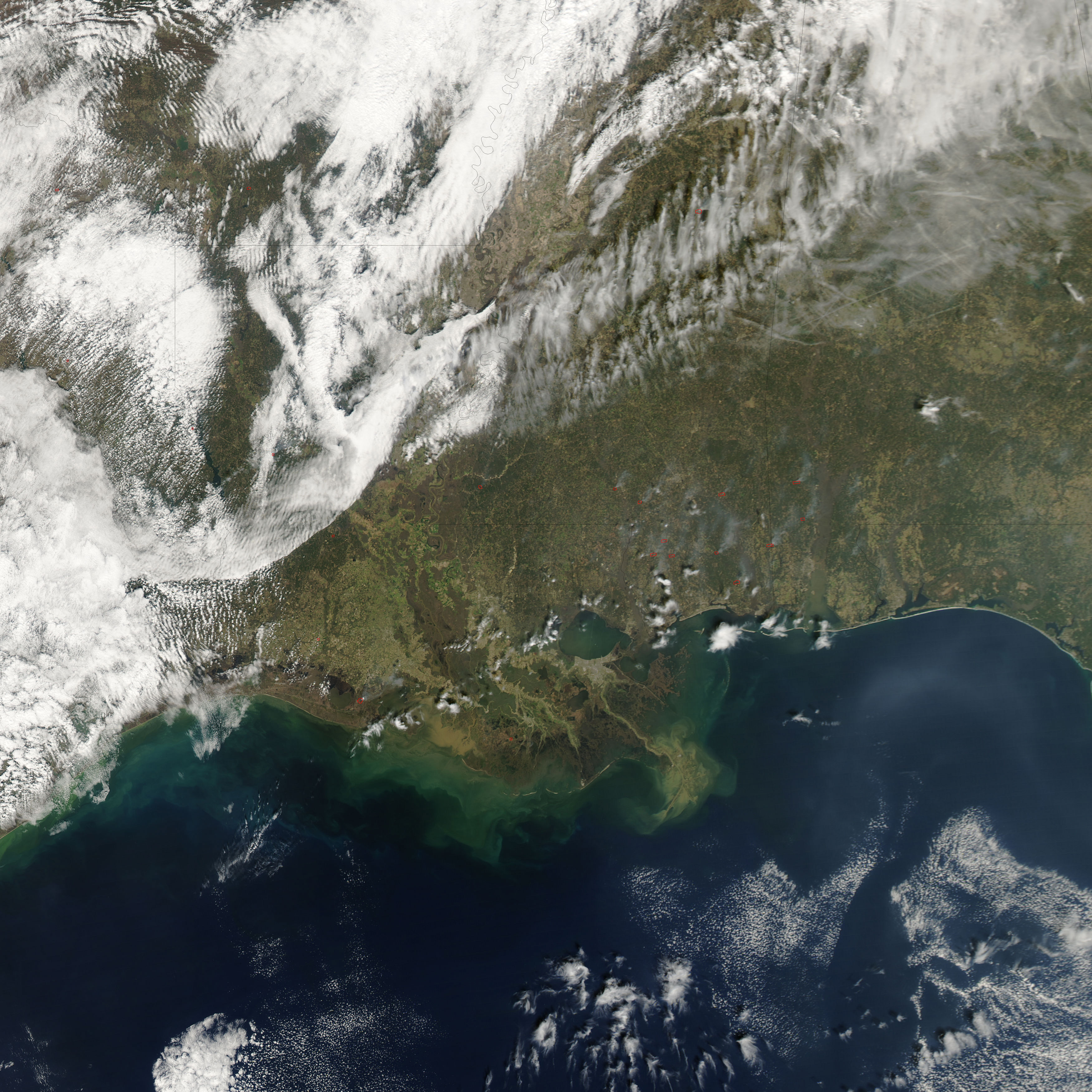 In the southern United States on March 5, 2006, a number of fires were puffing small plumes of smoke that created hazy conditions across the region. This image of Louisiana, Mississippi, Alabama, and Florida was captured by the Moderate Resolution Imaging Spectroradiometer (MODIS) on NASA’s Aqua satellite. Places where the sensor detected actively burning fires are outlined in red. In Alabama, several individual puffs of smoke are visible in locations where the sensor did not detect a fire. This may be because those fires were not hot enough or large enough for the sensor to register them as “hot spots.” A swath of haze lingers over the Gulf of Mexico at lower right. At lower left is the Mississippi River Delta.