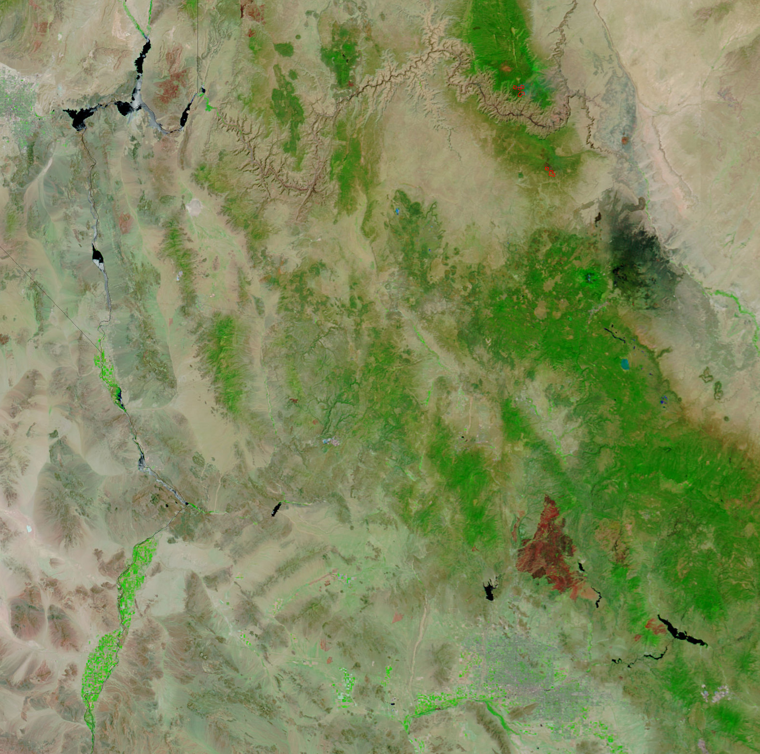 In the mountains north of Phoenix, Arizona, the Cave Creek Fire has been contained at 248,310 acres at a cost of $18.3 million. In this infrared-enhanced image from the Moderate Resolution Imaging Spectroradiometer (MODIS) on NASA’s Terra satellite from July 11, 2005, the deep red burn scar sprawls across the green vegetation of the Tonto National Forest. The burned area appears to cover almost as much area as the city of Phoenix, near the bottom center of the image.