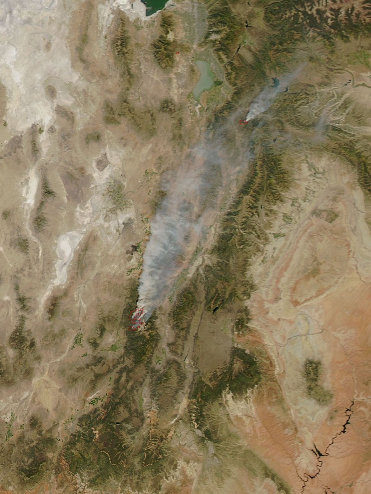 Strong winds and dry air created dangerous fire conditions in parts of Utah on September 19, 2010. Blowing from the southwest, the winds were pulling thick plumes of smoke north in the midafternoon when the Moderate Resolution Imaging Spectroradiometer (MODIS) on NASA’s Aqua satellite acquired this photo-like image. The fires are outlined in red.