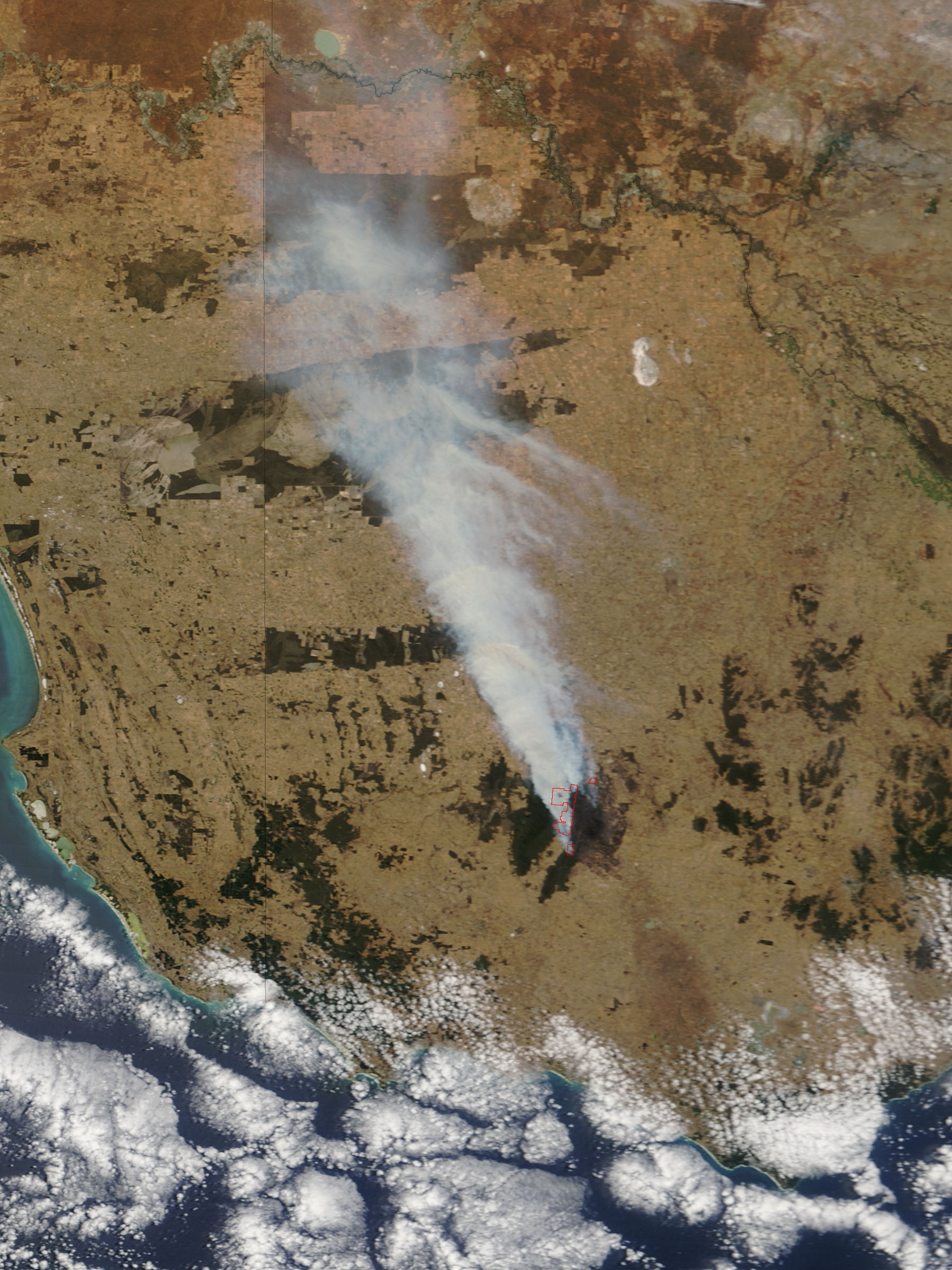 In southwestern Victoria, Australia, a dangerous wildfire was raging on January 24, 2006, when the Moderate Resolution Imaging Spectroradiometer (MODIS) on NASA’s Terra satellite passed overhead and collected this image. The dark green vegetation of Grampians National Park is shrouded with smoke that drifts hundreds of kilometers to the north before crossing westward into South Australia. The actively burning areas of the fire detected by MODIS are outlined in red. According to a news report from January 24, more than a dozen houses had been lost in the fire, which had burned more than 90,000 hectares (900 square kilometers, which is a little more than 222,000 acres).