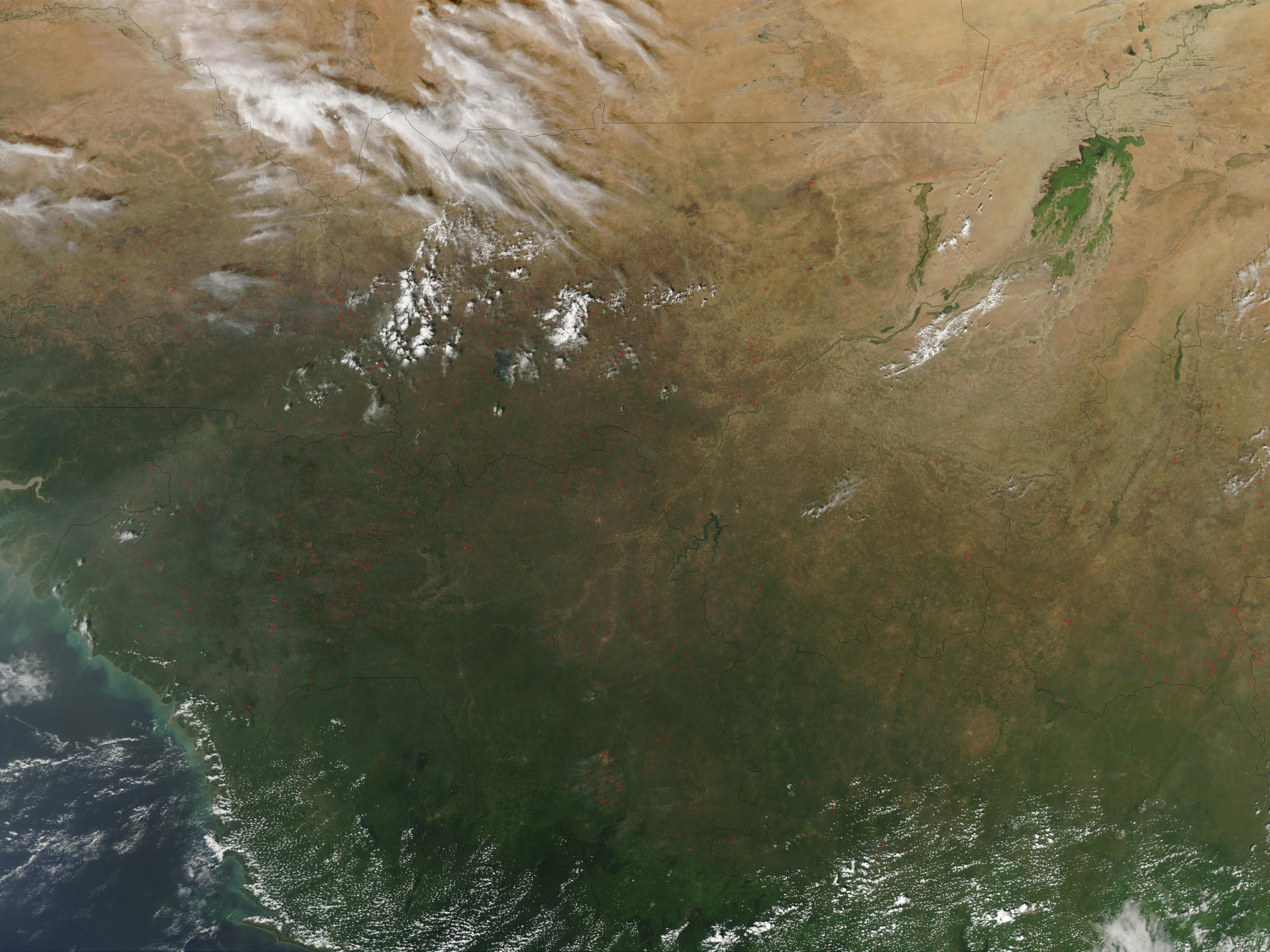 This true-color Moderate Resolution Imaging Spectroradiometer (MODIS) image of West Africa was captured by the Aqua satellite on November 11, 2002. Countires shown are (clockwise from upper left) Senegal, Mauritania, Mali, Burkina, Cote D’ Ivoire, Sierra Leone, Guinea, and Guinea Bissau. At upper right a large area of wetlands along the Niger River makes a green splash against the southern reaches of the Sahara Desert. The tans and oranges of the Sahara fade into soft greens where the Sahel begins; farther south, the Sahel transitions to the savannas, which appear darker green. Scores of fires (marked with red dots) were burning throughout the region; these fires, part of the annual burning cycle of the continent, are largely agricultural in purpose, though sometimes burns intended only to clear land for planting crops escape control and spread as wildfires.