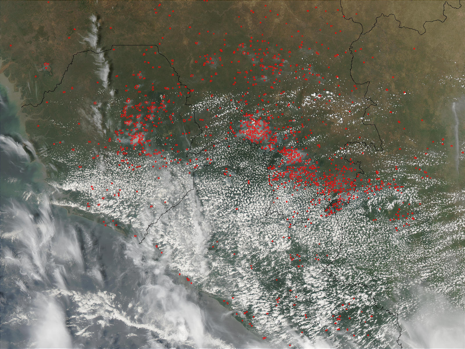This Aqua satellite image from the Moderate Resolution Imaging Spectroradiometer (MODIS) shows hundreds of fires burning in West Africa on March 19, 2003. Smoke mixes with clouds along the coast.