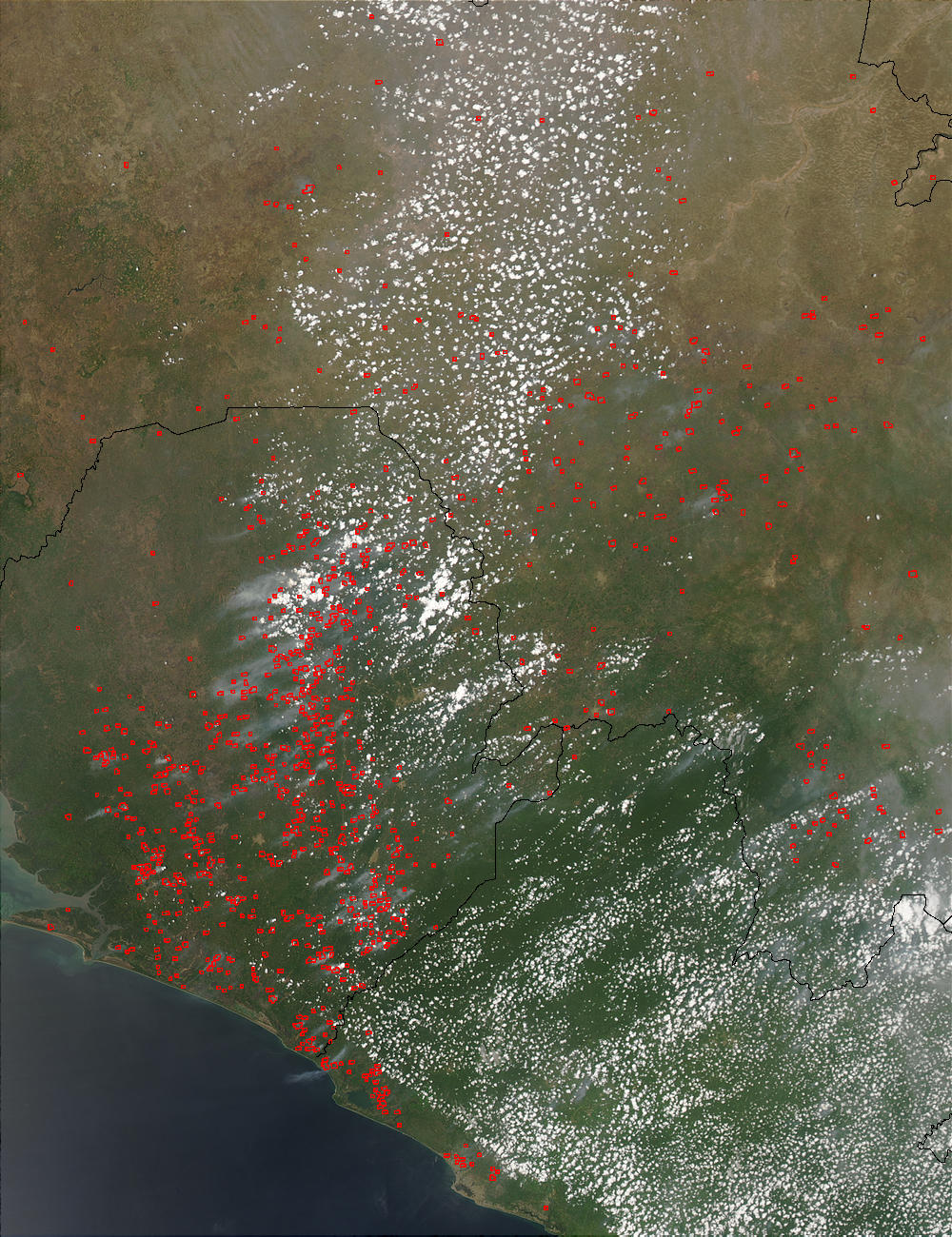 The West Africa biomass burning season that began in November 2002 is still underway in late March 2003. This true-color Moderate Resolution Imaging Spectroradiometer (MODIS) image from the Aqua satellite on March 24, 2003, shows scores of fires heavily concentrated in Sierra Leone, with other fires scattered across Guinea (top) and Liberia (bottom right).