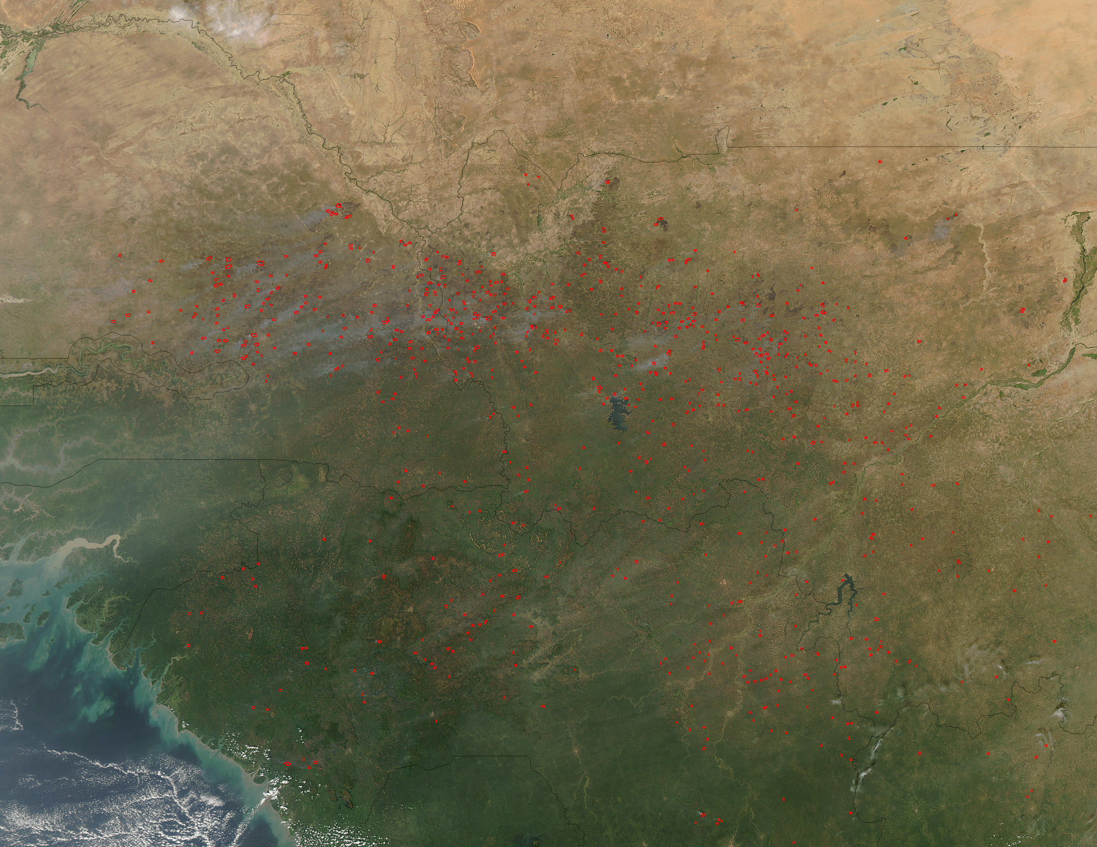Fire activity in Africa south of the Sahara Desert migrates across the continent with the seasons. In the Sahel and savannas just south of the Sahara, the agricultural burning season begins in Norhtern Hemisphere fall and progresses toward a peak of activity in mid-winter. In this image of western Africa, fires (marked in red) have been detected across several West African nations: (clockwise from right center) Mali, Ivory Coast, Guinea, Sierra Leone, Guinea-Bissau, Senegal, and the Gambia. At top is Mauritania. This image was captured by the Moderate Resolution Imaging Spectroradiometer (MODIS) on the Aqua satellite on November 14, 2003.