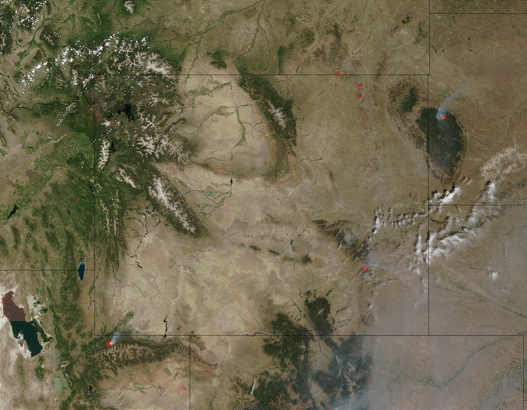 Fire season is clearly underway in the West. This Moderate Resolution Imaging Spectroradiometer (MODIS) image from June 30, 2002, focuses on Wyoming (center). In the southern portion of the state, the Reese Mountain Fire is threatening homes and businesses. In the northern part of the state, firefighters? efforts to construct containment lines around the Daly Draw Fire (northeastern-most red dot) were thwarted when 70 mile-per-hour winds forced the fire across all containment lines. To the east in South Dakota, the Grizzly Gulch Fire has destroyed at least two residences.