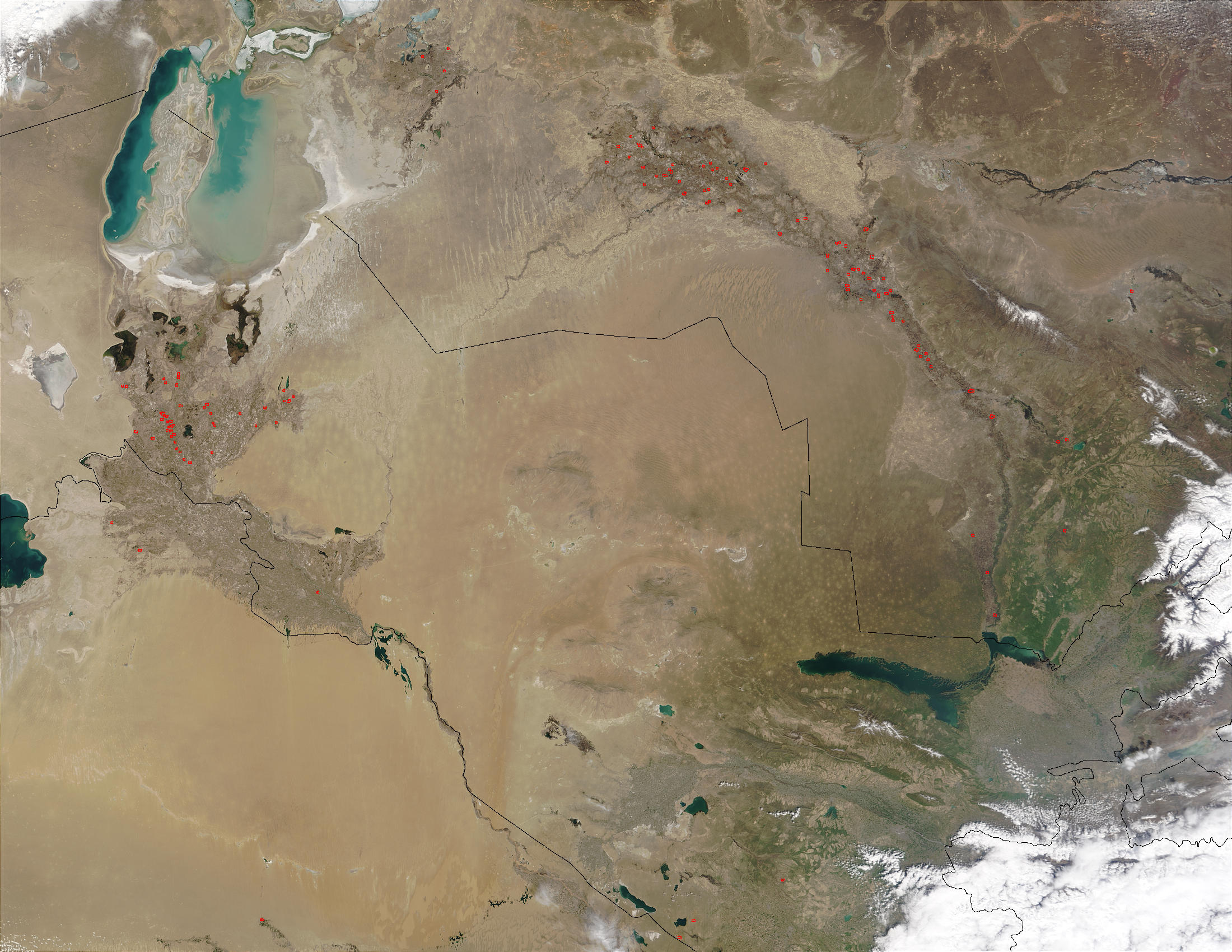 On April 3, 2003, the Moderate Resolution Imaging Spectroradiometer (MODIS) on the Terra satellite detected numerous fires (red dots) burning along the Sydar’ya River in Kazakhstan (upper right) and the Amudar’ya River in northwestern Uzbekistan (left). At bottom left is Turkmenistan. At upper left is the Aral Sea.