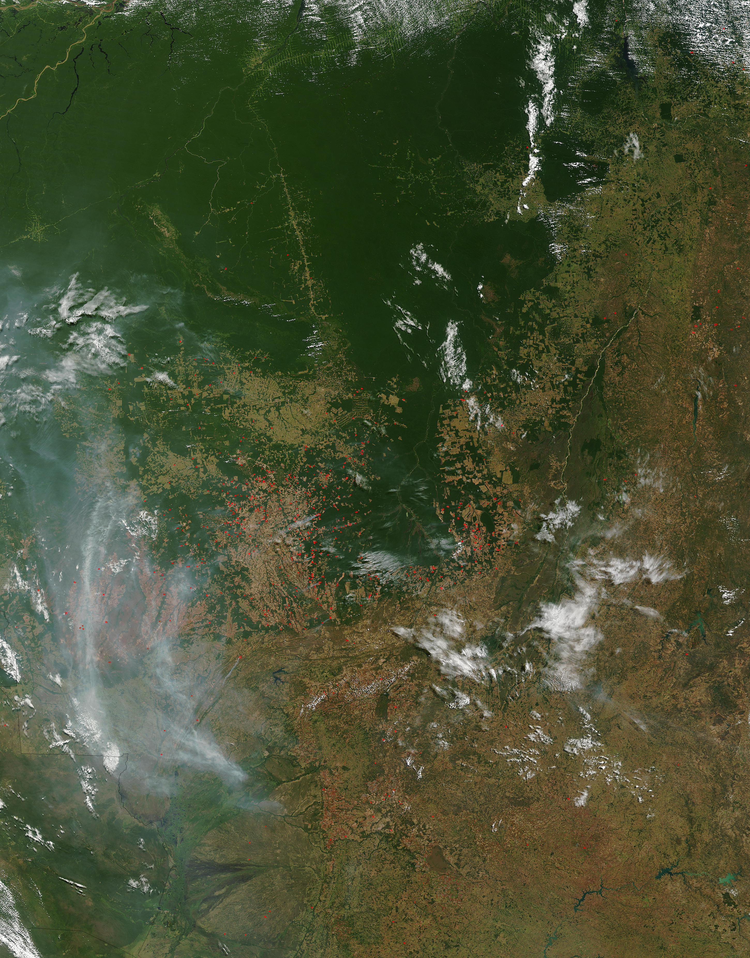 In northern Mato Grosso, Brazil, land cover change from dense rainforest to roads and agricultural land is often achieved through fire. People also use fire to maintain agricultural and pasture land. This image from the Moderate Resolution Imaging Spectroradiometer (MODIS)on NASA’s Terra satellite from July 15, 2004, shows numerous fires (marked in red) surrounding the Xingu Indigenous Peoples Park, located in the headwaters of the Xingu River. To the east is the Bananal Wetlands surrounding the Araguaia River. In the top part of the image, the dense rainforest is a nearly uniform wash of vibrant green. The forest is now laced with roads, which appear as fuzzy, light green lines. The fuzziness comes from clearings that have sprung up along the roads.