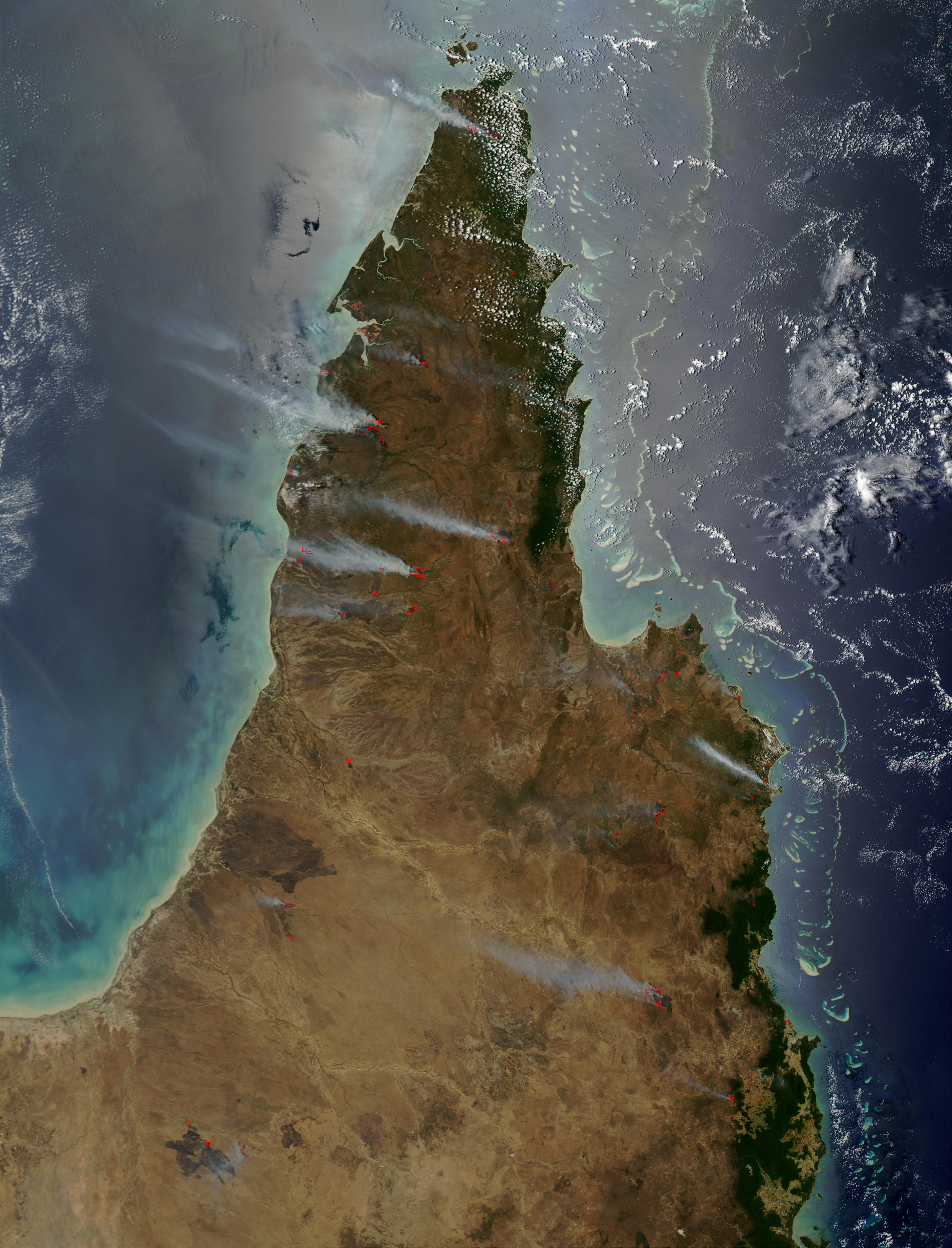 On the Cape York Peninsula in Queensland, Australia, numerous large fires were detected by the Moderate Resolution Imaging Spectroradiometer on the Aqua satellite on October 19, 2002. Burn scars are especially prominent on the western half of the Peninsula as dark brown patches against the dun-colored landscape.