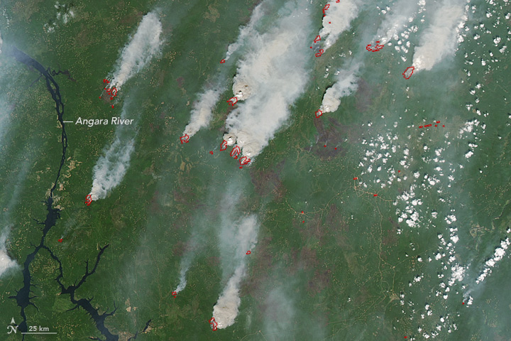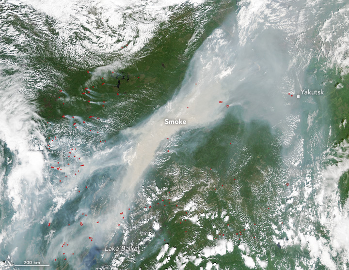 On June 22, 2017, the Moderate Resolution Imaging Spectroradiometer (MODIS) on NASA’s Aqua satellite acquired the first two natural-color images of fires near Lake Baikal and the Angara River. The next day, Aqua MODIS acquired the third image (below), which shows dense smoke plumes spreading northeast toward Yakutsk. Red outlines on each image are hot spots detected by MODIS where surface temperatures indicate the presence of fire.