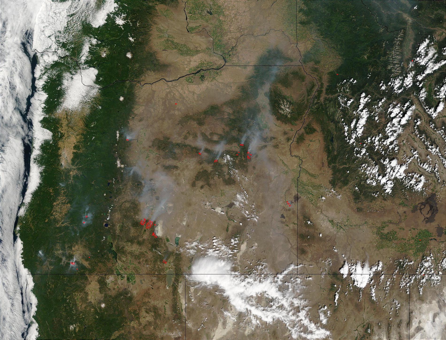 Wildfires continue to scorch thousands of acres in Oregon. This Moderate Resolution Imaging Spectroradiometer (MODIS) image from July 17, 2002, shows numerous fires (red dots) burning throughout the state. The increasing number and continuing growth in the state’s wildfires has led the government to offer 650 Army soldiers as temporary firefighters to the state, according to news reports.