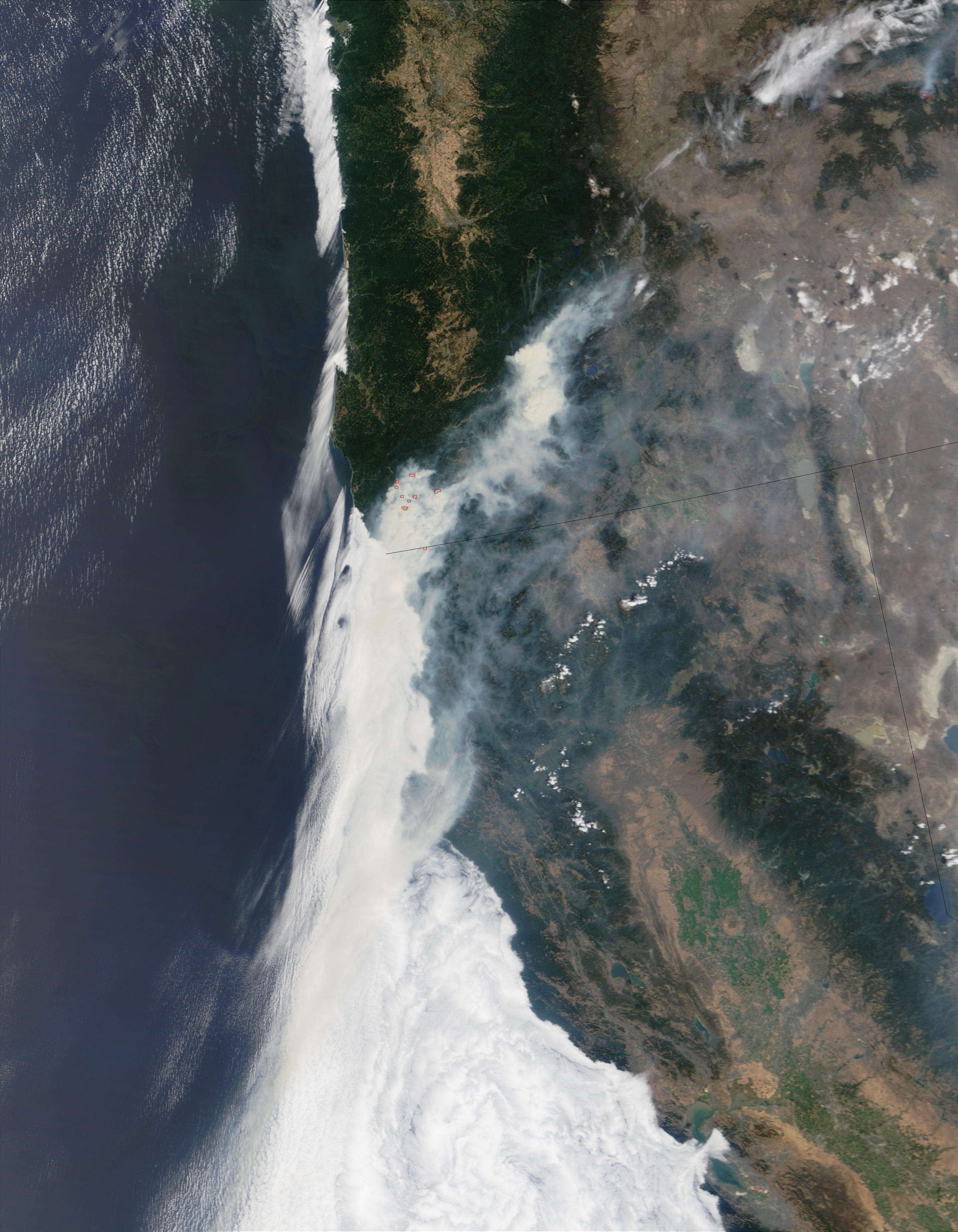 Fires in southwestern and south central Oregon continue to create major problems for residents and firefighters. Thousands of people are under evacuation notices and must be prepared to leave their homes in under an hour should fires come too close. This Moderate Resolution Imaging Spectroradiometer (MODIS) image from August 1, 2002, shows the active fire detections (red dots) associated with the various fronts of the Florence Fire (north) and Sour Biscuit Fire (south) which are burning within miles of each other. If the two should combine they would total more than 200,000 acres.