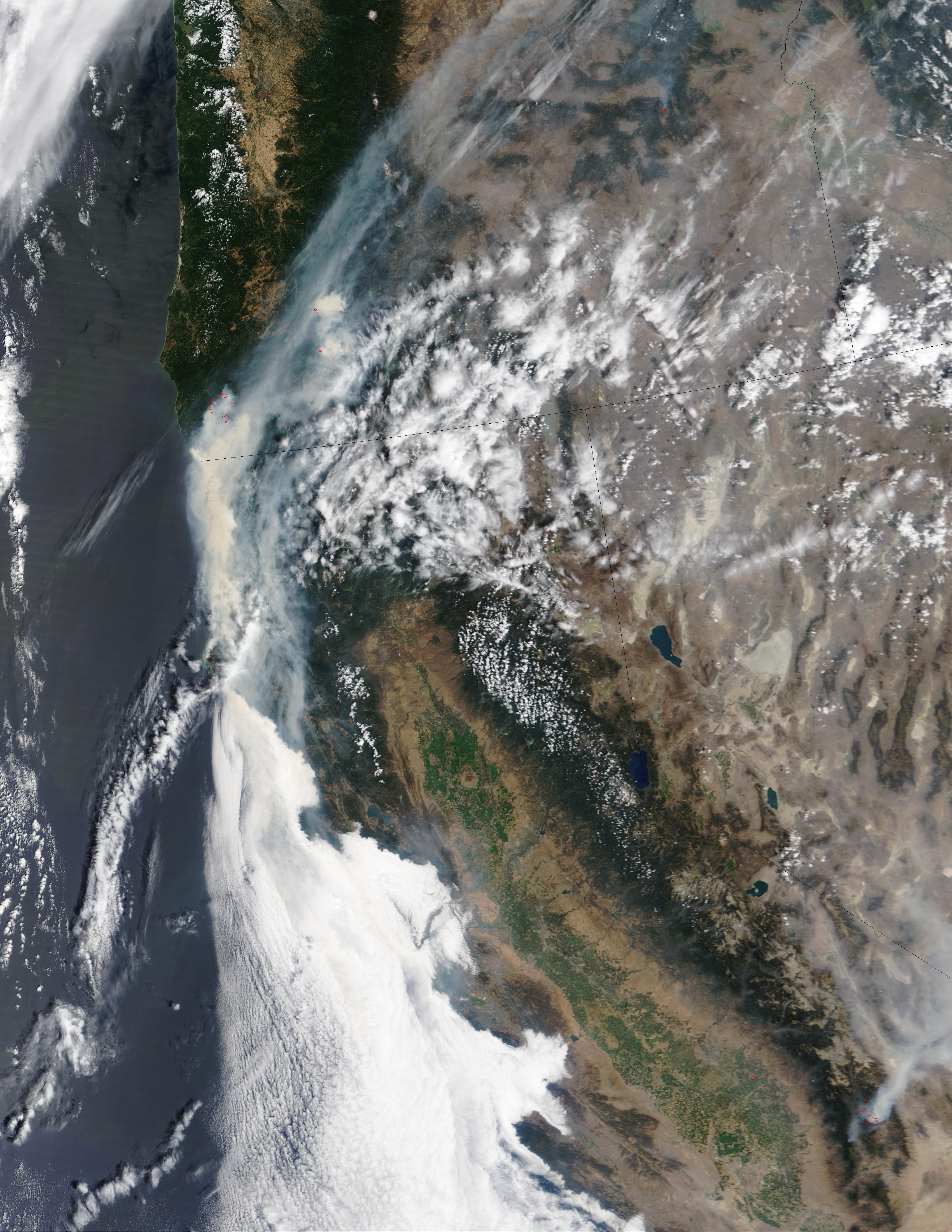 Almost 440,000 acres are burning in Oregon as of August 4, 2002. Almost half of those acres are comprised of two large fires (red dots near coastline) in the southwest portion of the state in the Klamath Mountains. The Florence Fire is more than 198,000 acres and only 5 percent contained. In places the terrain is so rugged and inaccessible that fire crews are detonating explosives in the ground to create fire breaks in places that are too difficult to manually construct. Just to the south is the Sour Biscuit Fire, begun in Oregon, but now burning down into California as well. This fire is about 40,000 acres and 15 percent contained. This image of the fires was captured on August 3, 2002 by the Moderate Resolution Imaging Spectroradiometer (MODIS).
