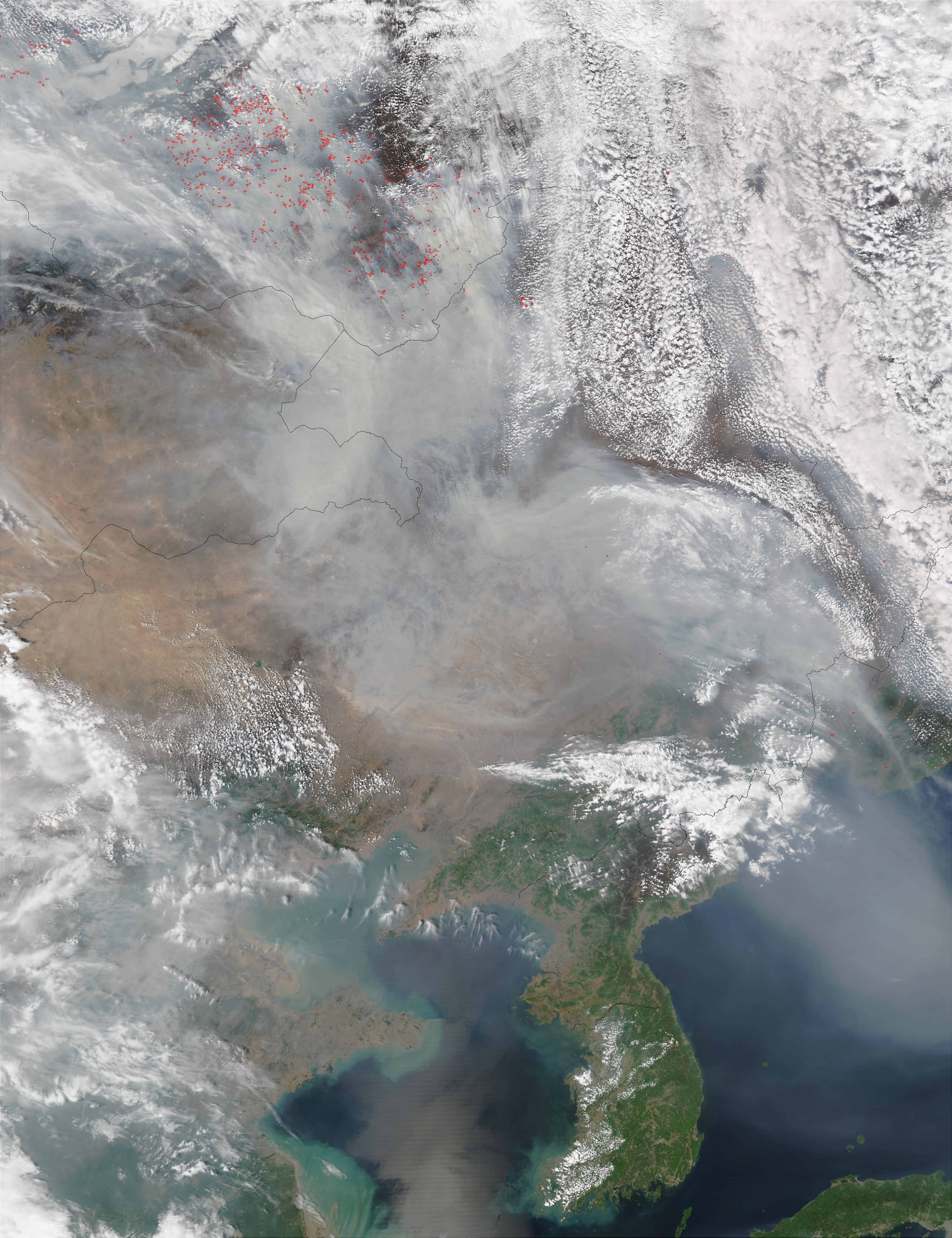 Fires burning across southern Russia are choking the skies with thick smoke in this Moderate Resolution Imaging Spectroradiometer (MODIS) image from the Aqua satellite on May 9, 2003. Large numbers of fires (detected by MODIS and marked with red dots) are burning in the terrain around Lake Baikal (top left of high-resolution image). They are spreading plumes of smoke southward hundreds of miles over China and the Korean Peninsula. Along with smoke, the fires are emitting carbon monoxide, which is drifting over the whole of East Asia.