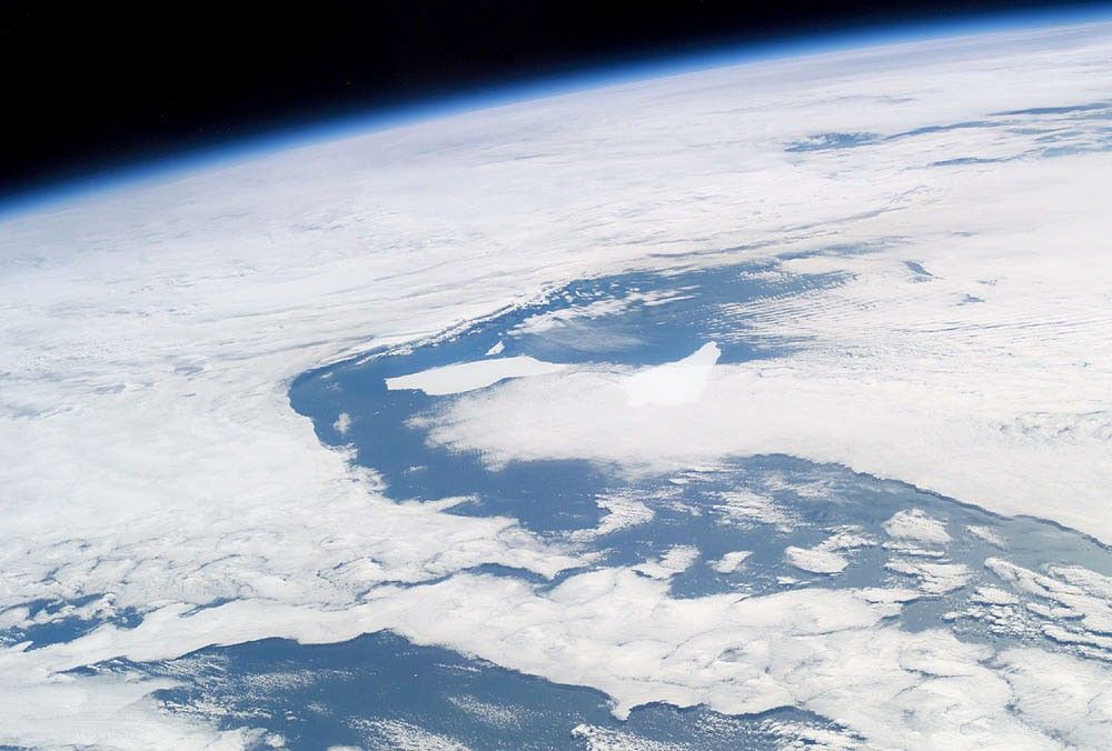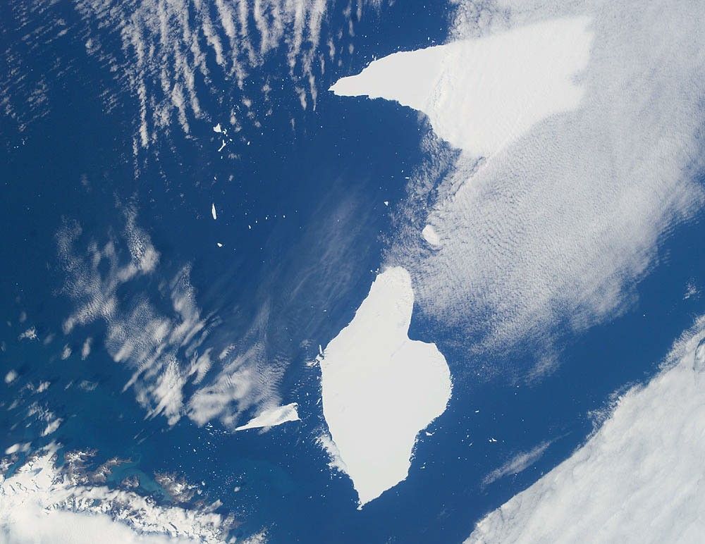 These photographs from the International Space Station show two pieces of a massive iceberg that broke off from the Ronne Ice Shelf in October 1998. Taken on January 6, 2004, the pieces of iceberg A-38 have floated relatively close to South Georgia Island. After 5 years and 3 months adrift, they are approximately 1,500 nautical miles from their origin. In the oblique image, taken a few minutes later, the cloud pattern is indicative of the impact of the mountainous islands on the local wind field. At this time, the icebergs are sheltered in the lee side of the island.