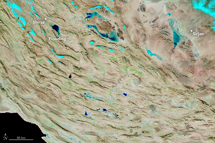 The Moderate Resolution Imaging Spectroradiometer (MODIS) on NASA’s Aqua satellite captured imagery of flooding in southern Iran on January 7, 2022. For comparison, the second image shows the same area on December 14, 2021, before the storms hit. The images are false color, using a combination of visible and shortwave infrared light (bands 7-2-1) to make it easier to distinguish between land and water. Dry land appears brown; vegetated areas are green. Areas covered by water are dark blue.