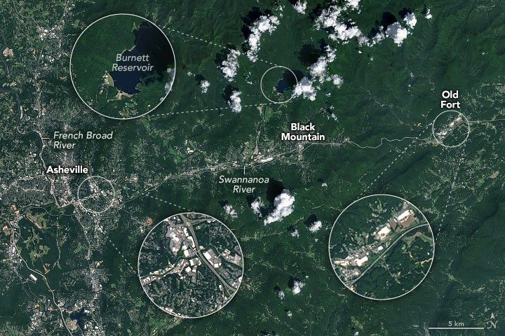 Many of the towns in these images suffered extensive damage. Water submerged large parts of Asheville, including the Rivers Arts District and Biltmore Village, according to the Asheville Citizen-Times. A day before this image was acquired, ABC9 reported that Black Mountain lacked power, water, sewer, and passable roads. In a story about Swannanoa, The Washington Post described mangled homes, mud-choked roads, and cars in tree limbs.