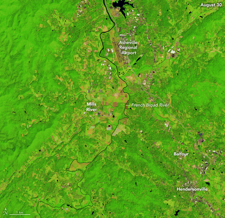 Many of the towns in these images suffered extensive damage. Water submerged large parts of Asheville, including the Rivers Arts District and Biltmore Village, according to the Asheville Citizen-Times. A day before this image was acquired, ABC9 reported that Black Mountain lacked power, water, sewer, and passable roads. In a story about Swannanoa, The Washington Post described mangled homes, mud-choked roads, and cars in tree limbs.
