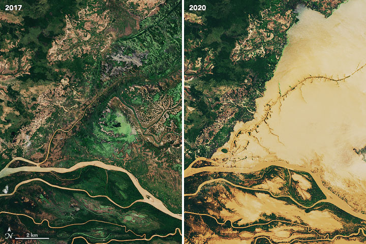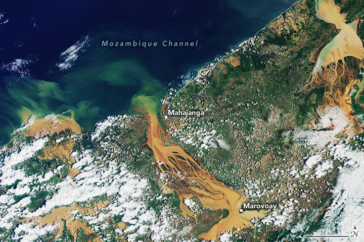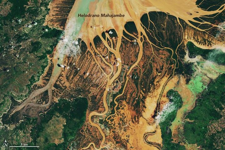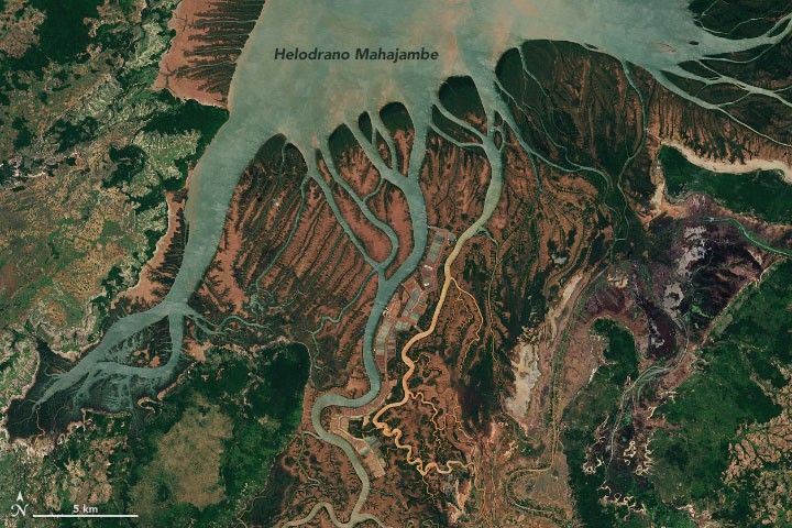 On January 27, 2020, the Operational Land Imager (OLI) on Landsat 8 captured natural-color images of sediment-filled rivers swollen out of their banks and pouring their outflow into Helodrano Mahajambe (Mahajambe Bay) in northwestern Madagascar. For comparison, the second image in each pair shows the same area under more typical seasonal conditions on January 18, 2017.