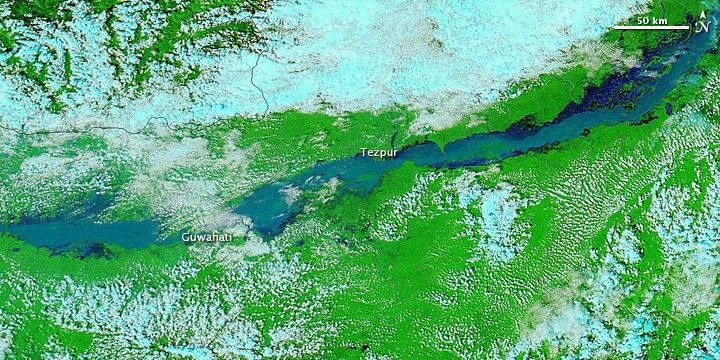 In September 2011, the Brahmaputra River flowed through braided channels, but a year later, the channels could not be detected in the swollen river. Flooded rivers often carry heavy sediment loads, and such sediment could account for the light blue color of the river in September 2012.