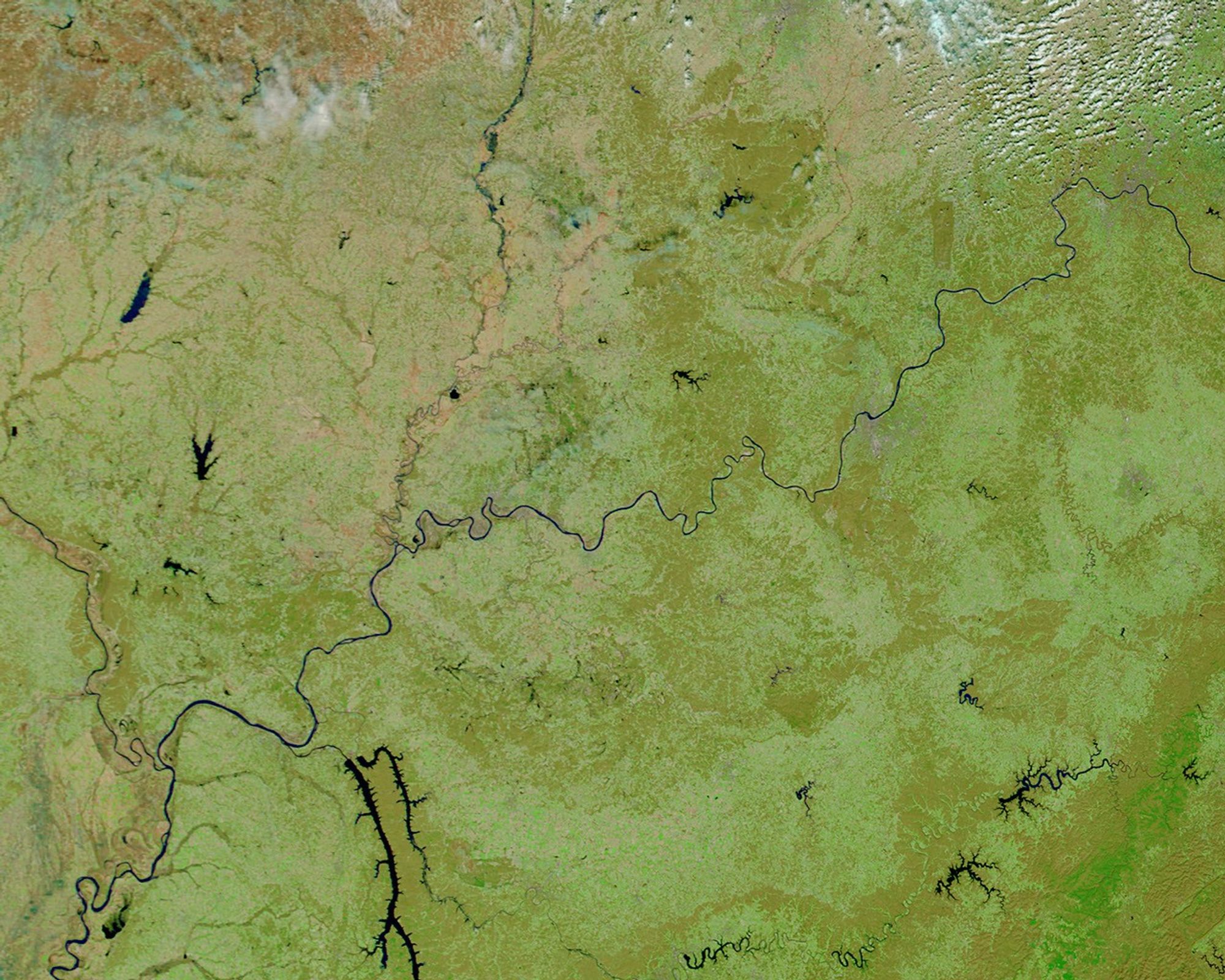 The Moderate Resolution Imaging Spectroradiometer (MODIS) on NASA’s Aqua satellite acquired the top image of flooding around the region on March 17, 2015. The second image, acquired by NASA’s Terra satellite on March 20, 2014, shows the same area during a more typical spring. Turn on the image comparison tool to see the difference.
