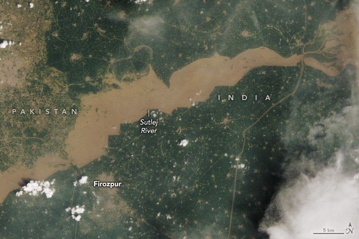 The Sutlej River flows southwest from India into Pakistan. Although the state of Punjab in India received about average rainfall since June, according to India’s Meteorological Department, excess rain has fallen on Ladakh and Himachal Pradesh, to the north. Between June 1 and August 25, Ladakh received almost three times as much rain as normal.